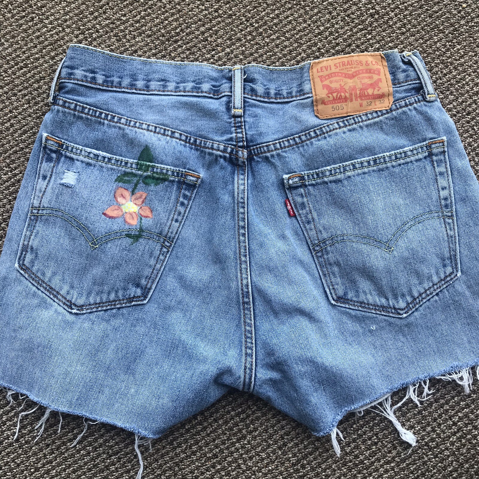 Levi s 505 Cut Off Denim Jean Shorts Frayed Destroyed Festival Rainbow Size 32