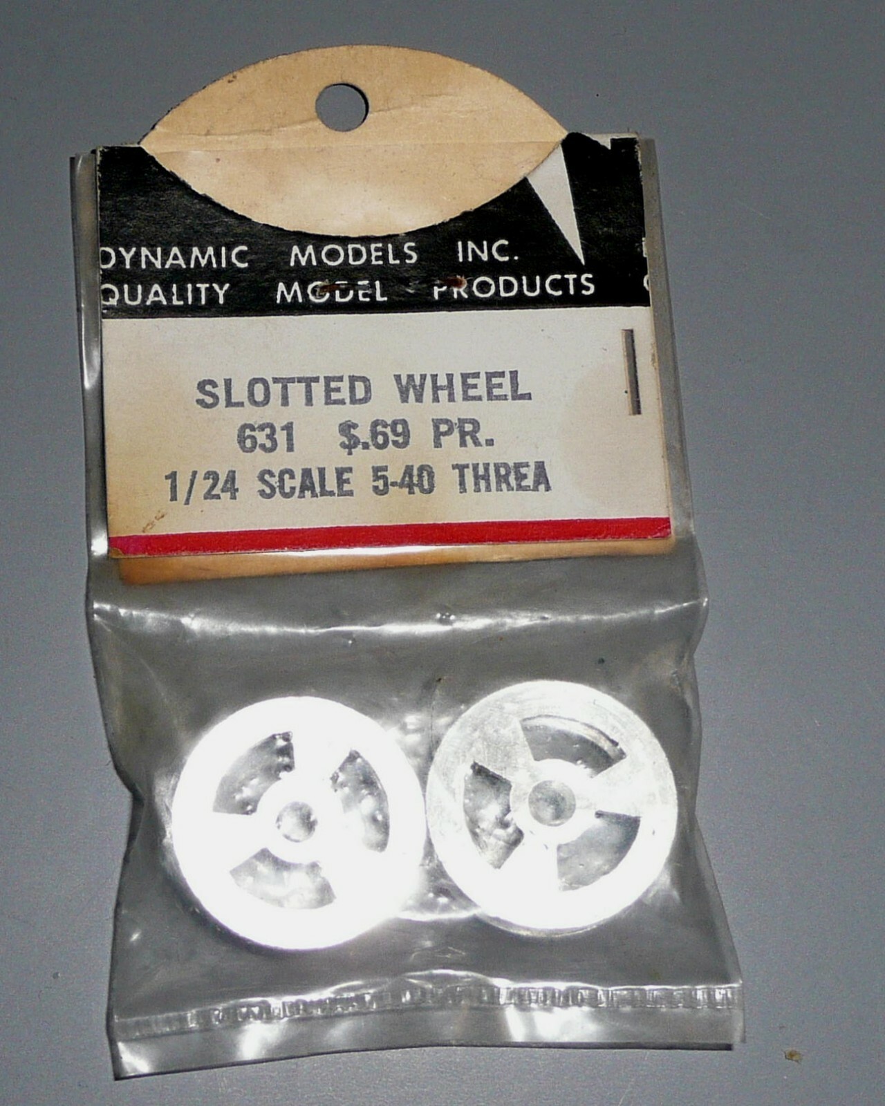 как выглядит DYNAMIC 1 PAIR SLOTTED WHEEL 3 SPOKE 1/24 631 SLOT CAR MOC 1960S NOS фото
