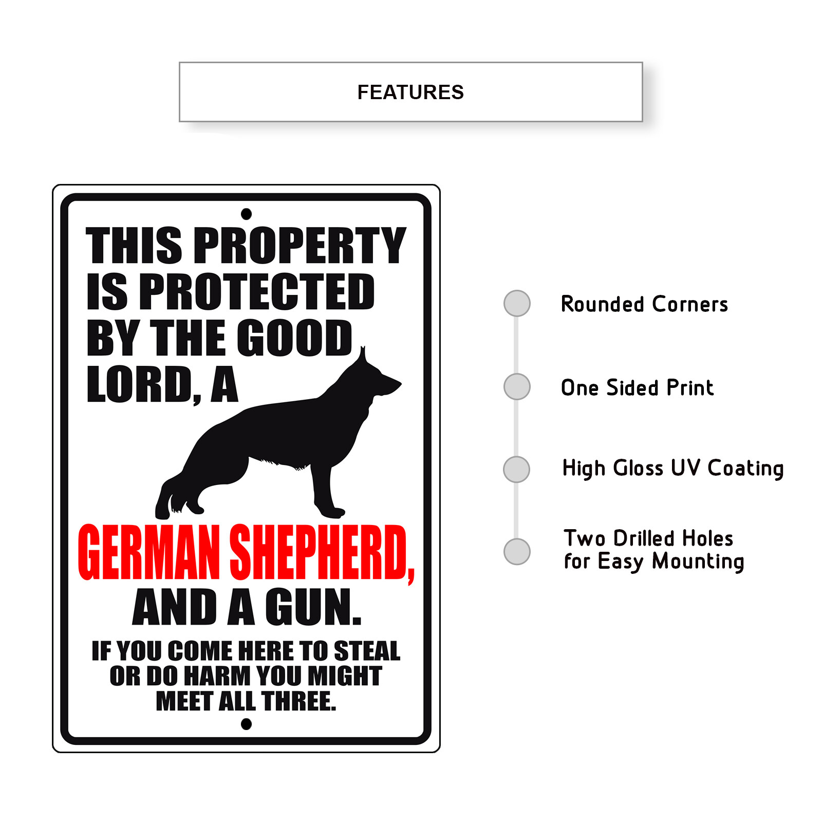 как выглядит This Property Is Protected By The Good Lord German Shepherd Aluminum Metal Sign фото