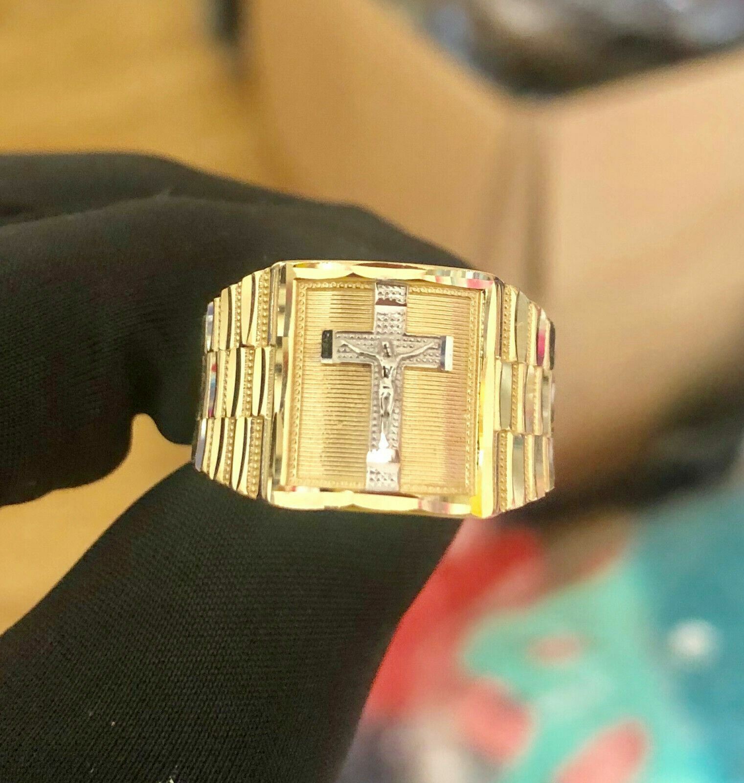 Mens Crucifix Jesus Cross 14k Yellow Gold Religious Ring