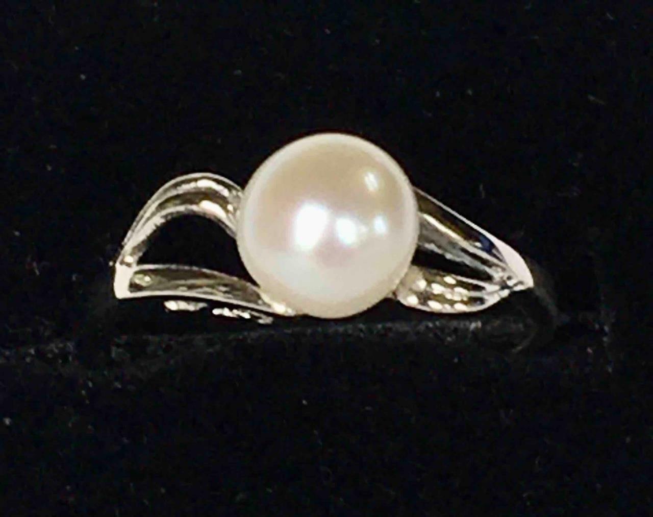 Brilliant Faux Pearl in this Sterling Silver Ring, Size 8