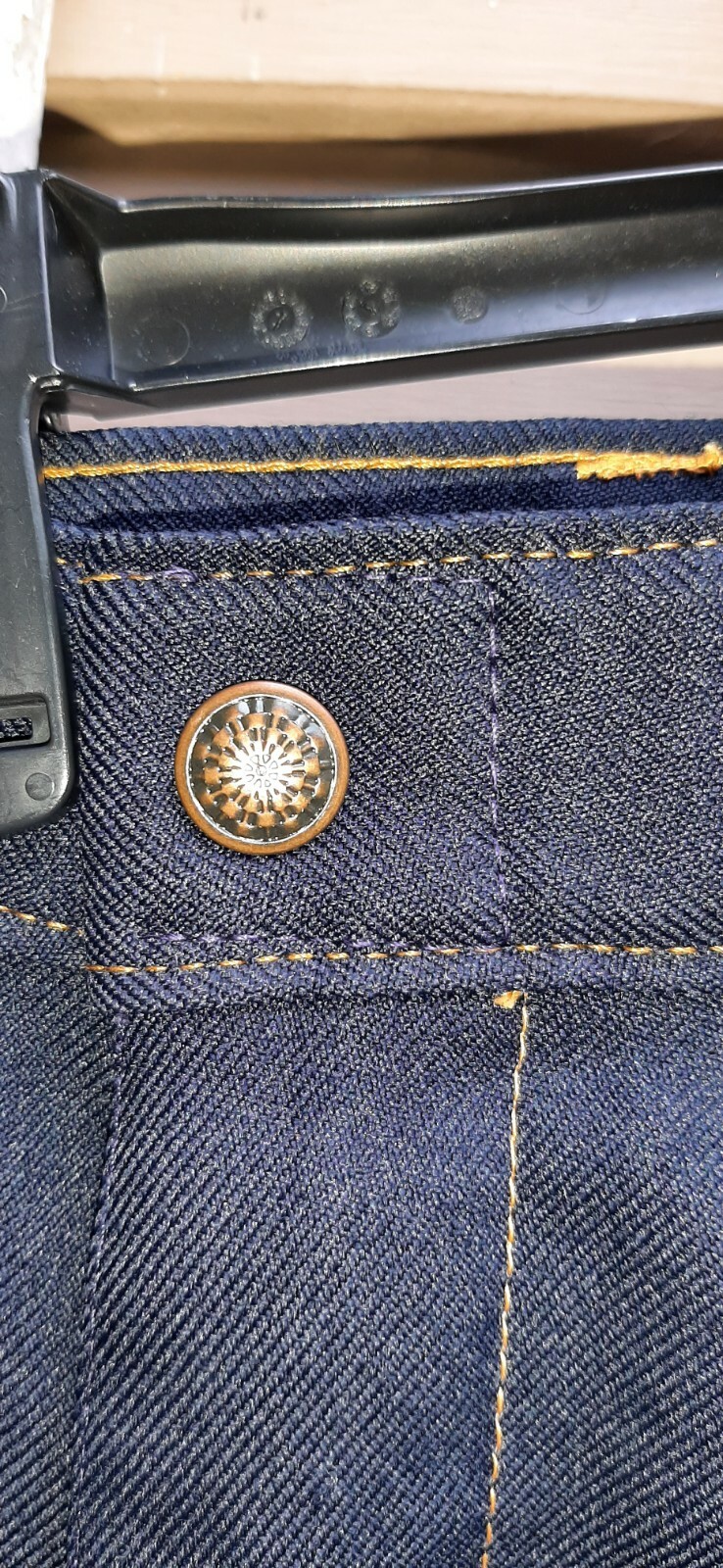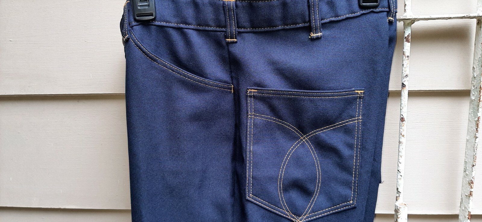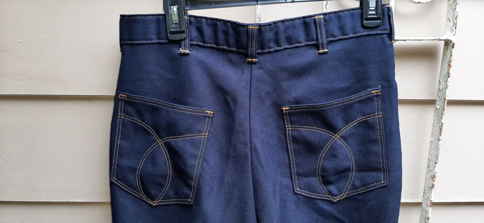 как выглядит Vintage 70s Mens Pants W/ Flares Navy With Gold Top Stitch 32 X 28 фото
