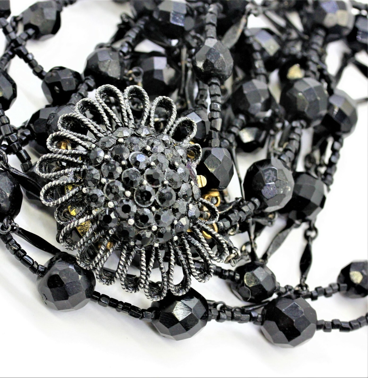 VINTAGE BLACK RHINESTONE flower clasp choker necklace 8 strands