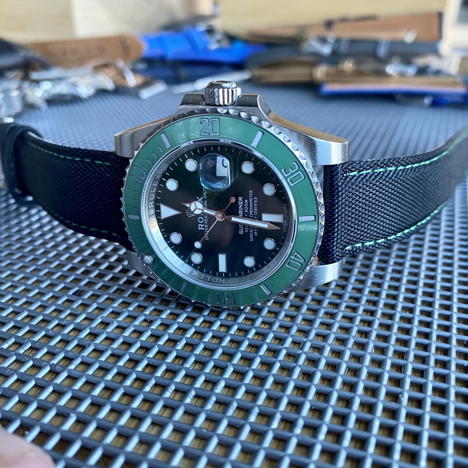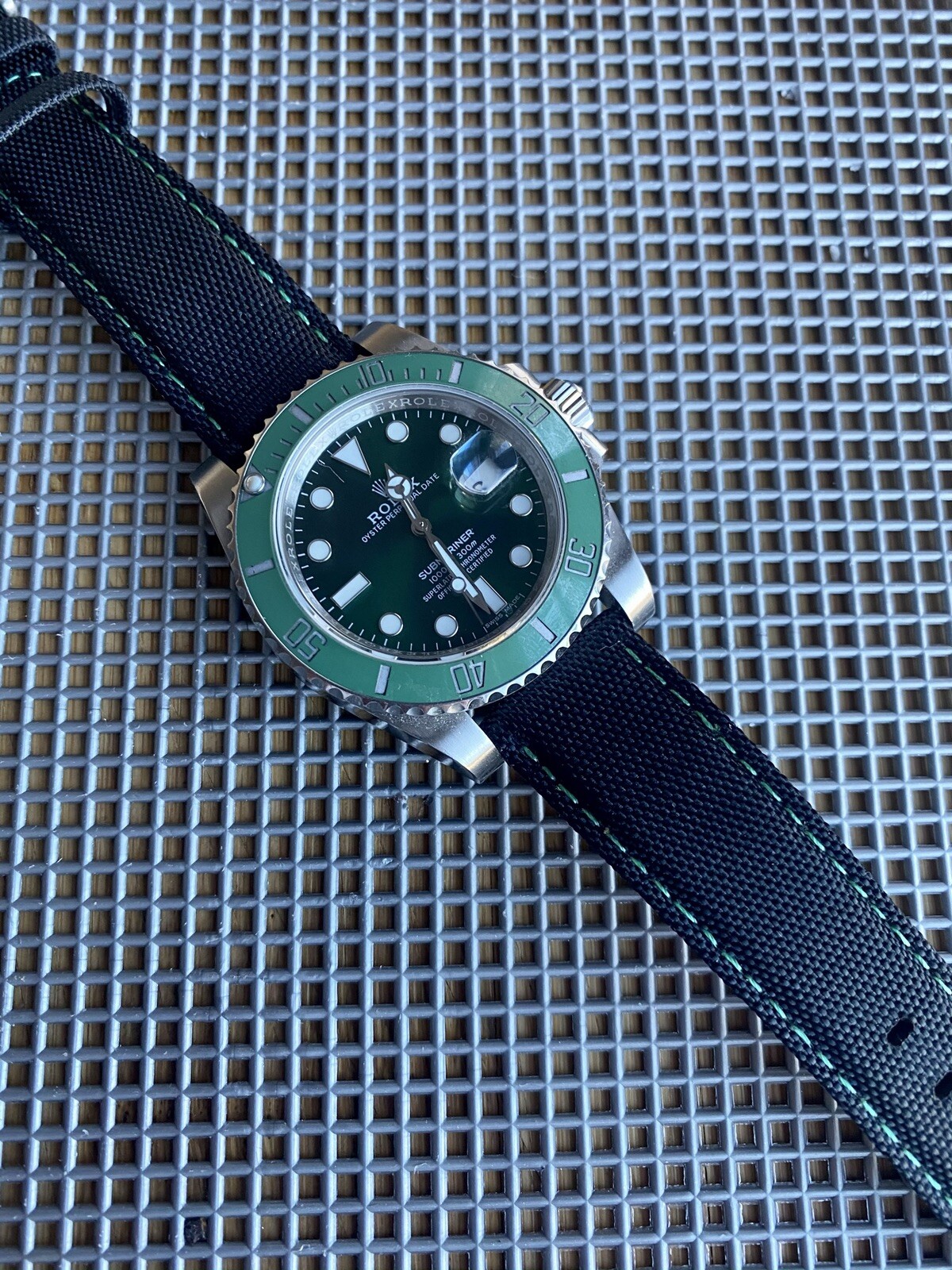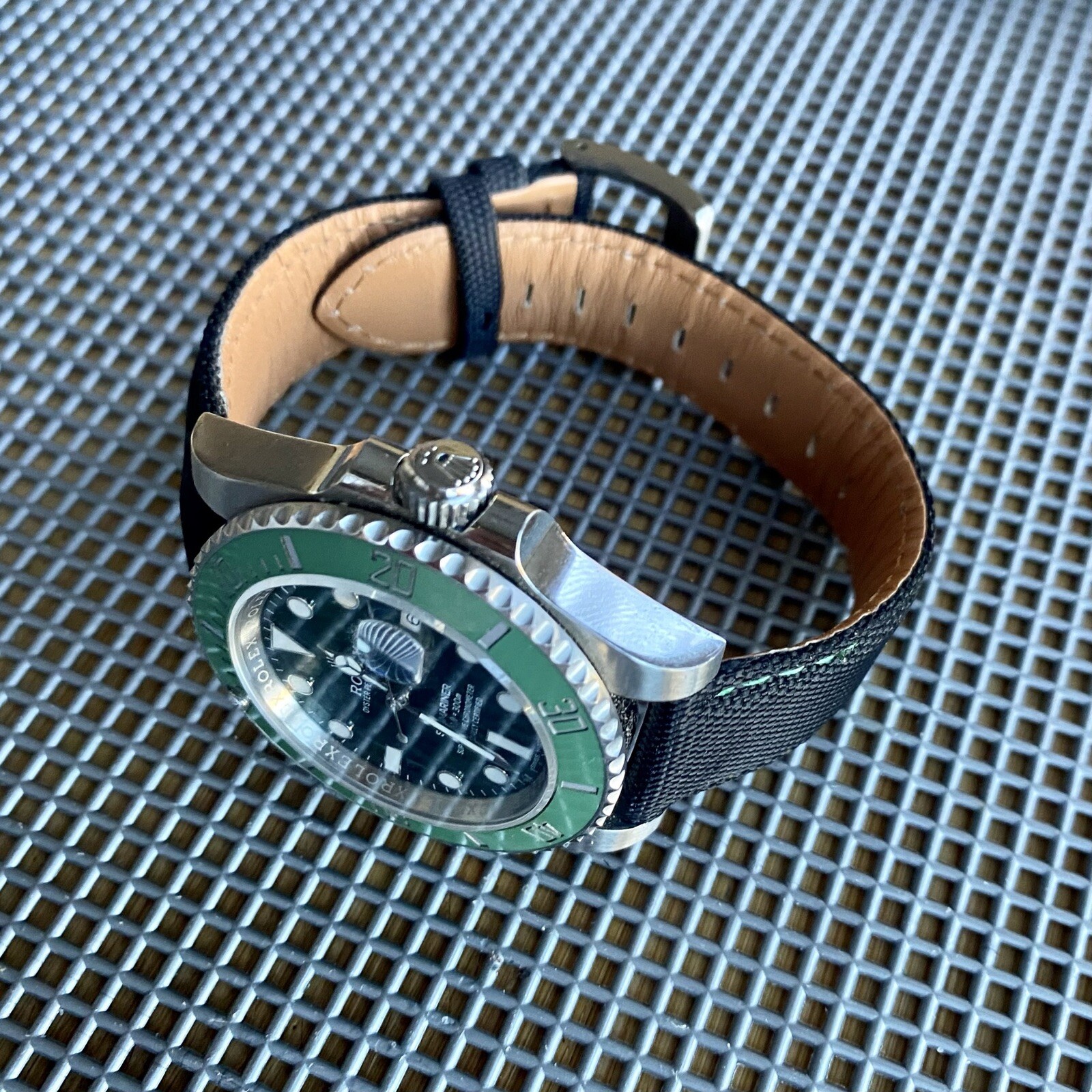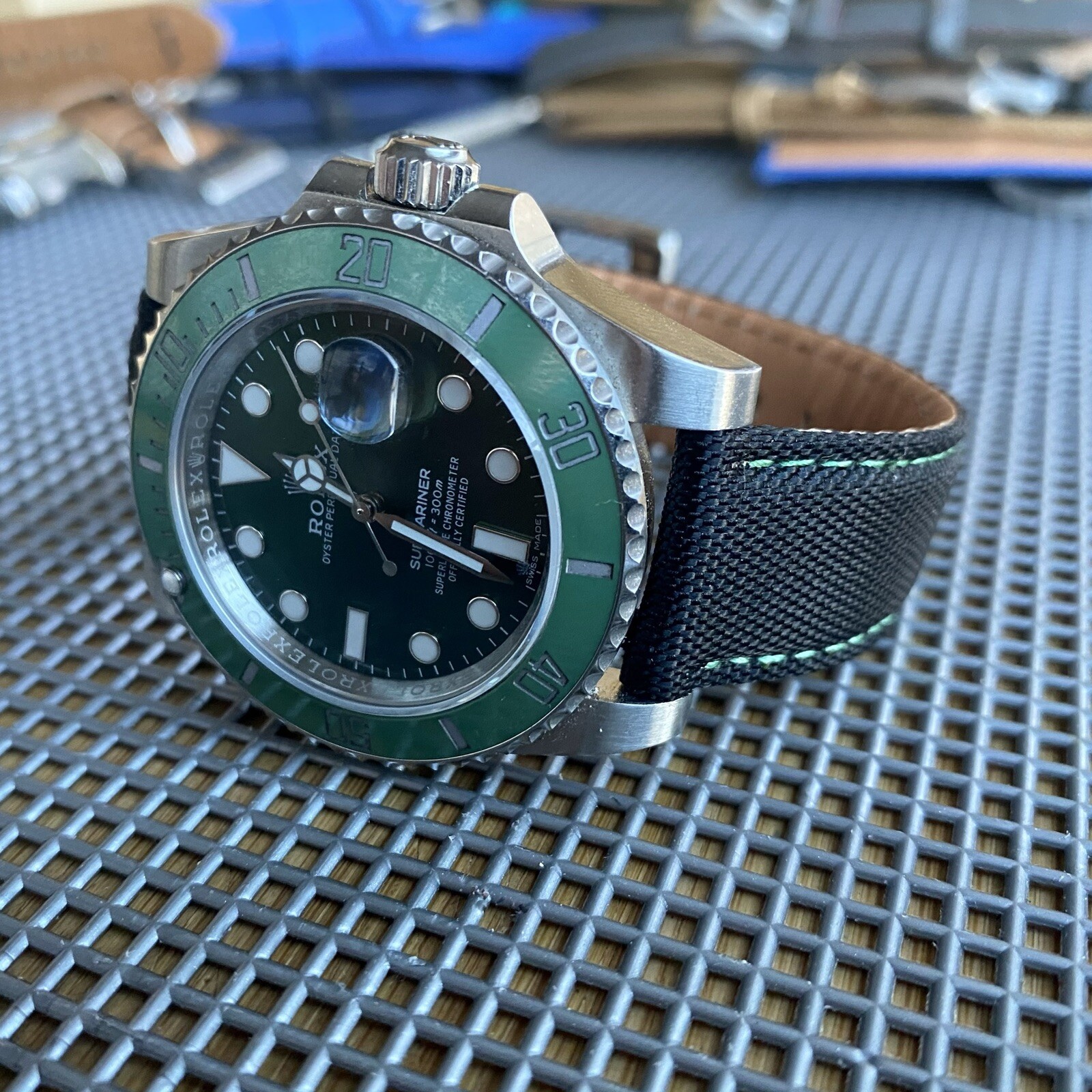 21mm BLUE Sailcloth Canvas/Leather watch band strap GREEN Stitch QR Bars