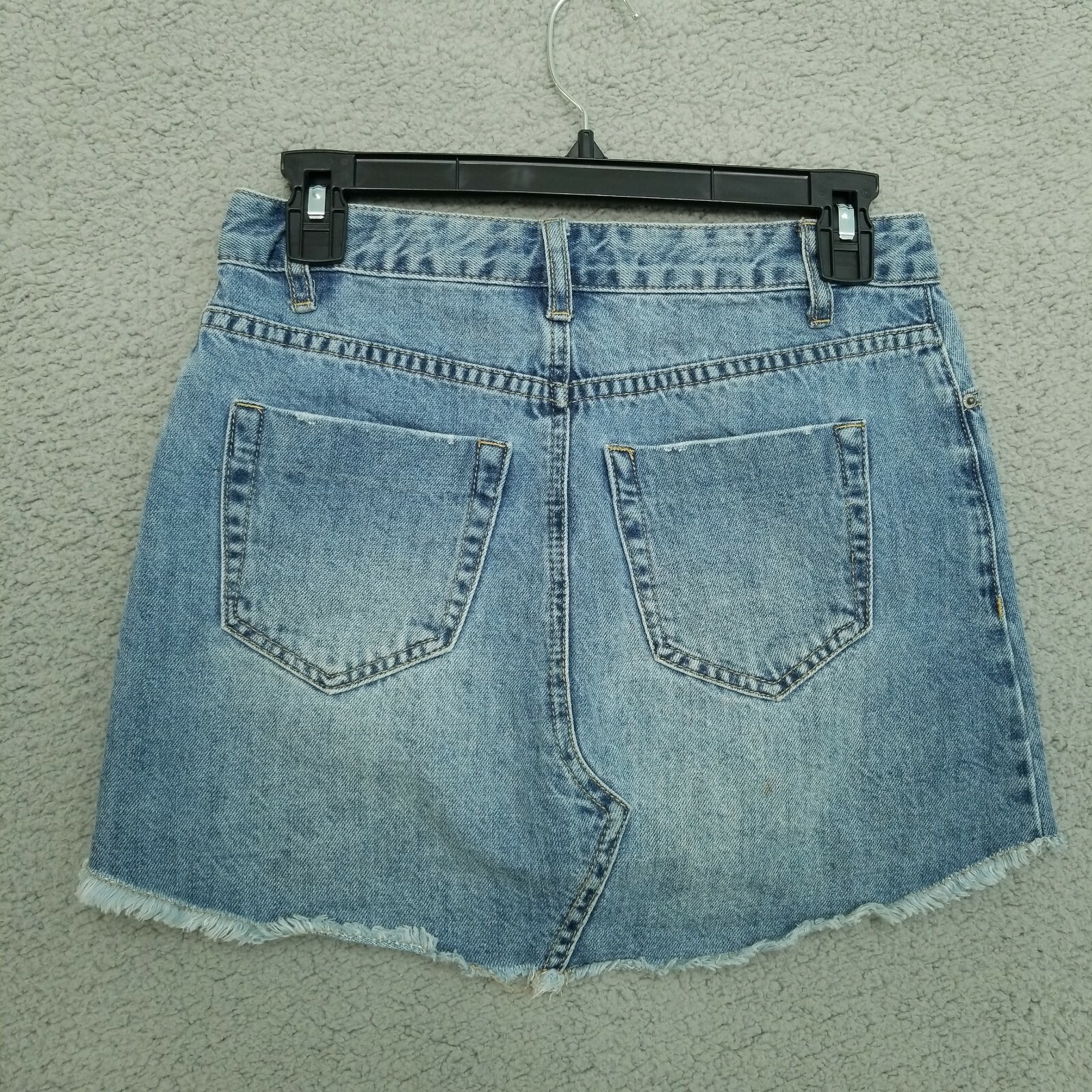 как выглядит Vanilla Star Jeans Mini Skirt Womens Size 3 Denim Blue High Low Distressed фото
