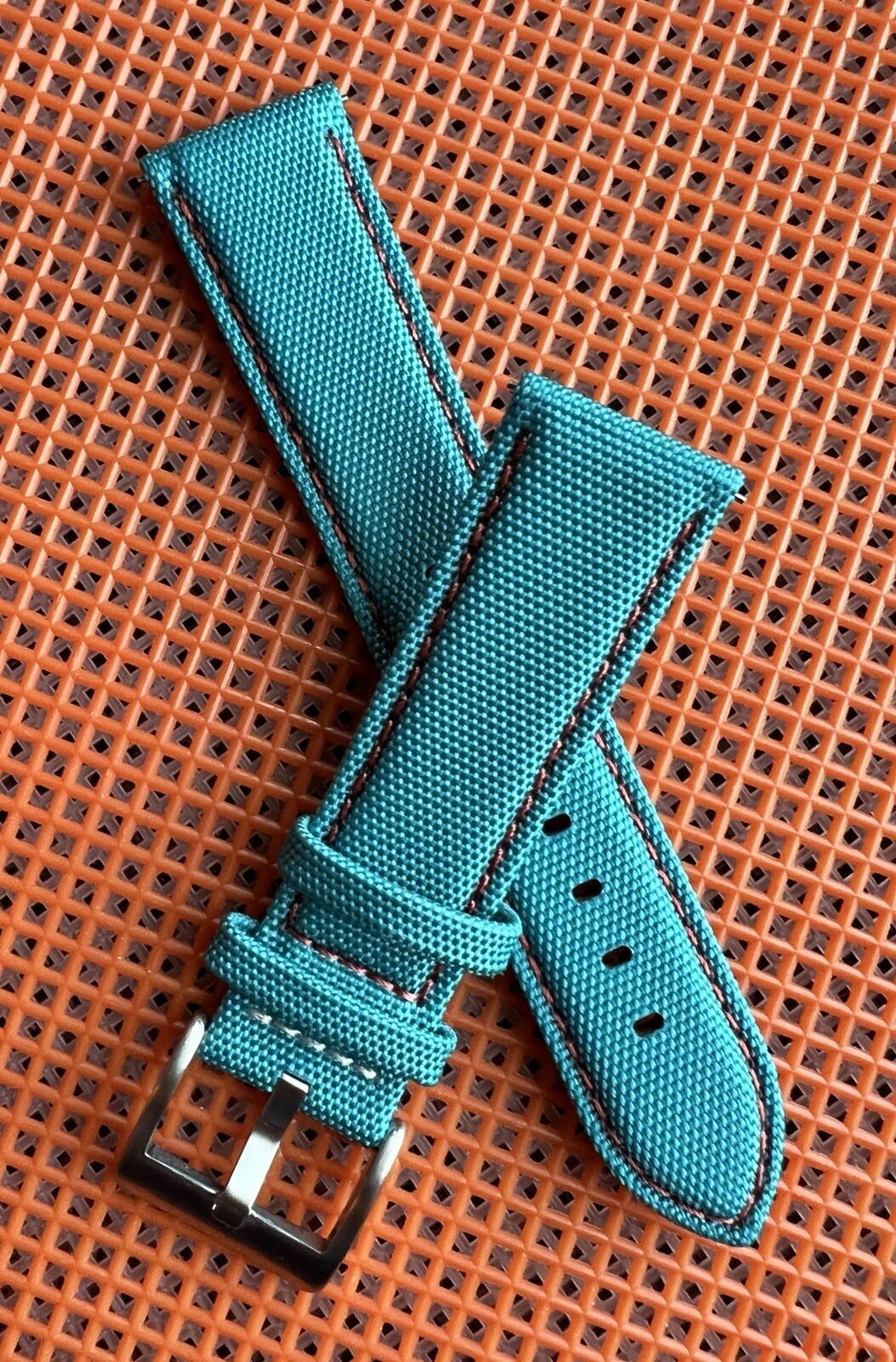 20mm AQUA BLUE Sailcloth Canvas/Leather watch band strap ORANGE Stitch QR Bars