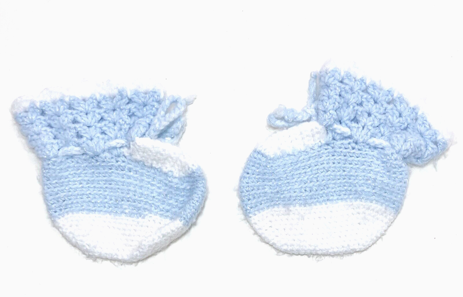 VINTAGE HAND KNIT BLUE WHITE KNIT INFANT BOOTIES, 4 LONG