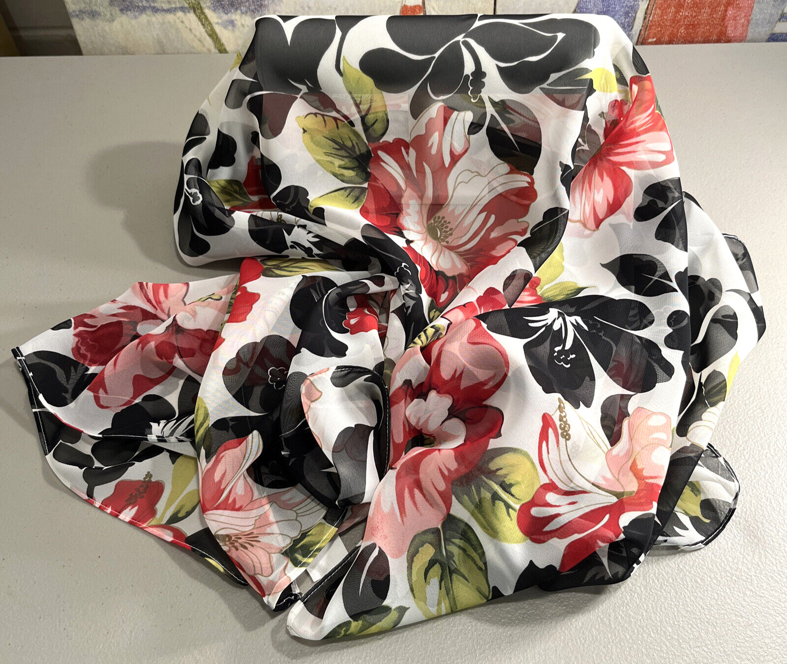 как выглядит Large Island Hibiscus Flower Gift USA Fashion Scarf Vintage EUC Floral 55" X 29" фото