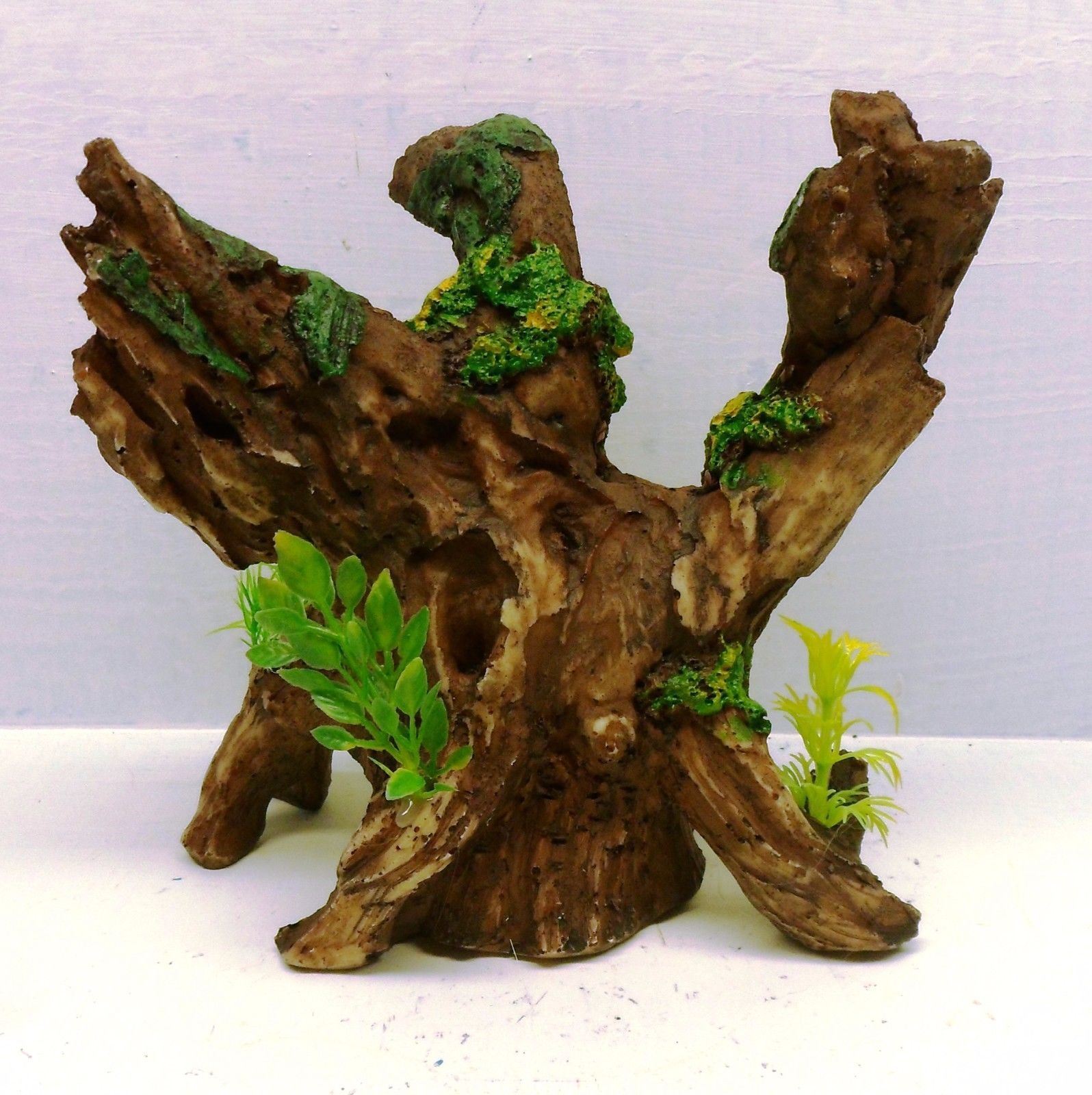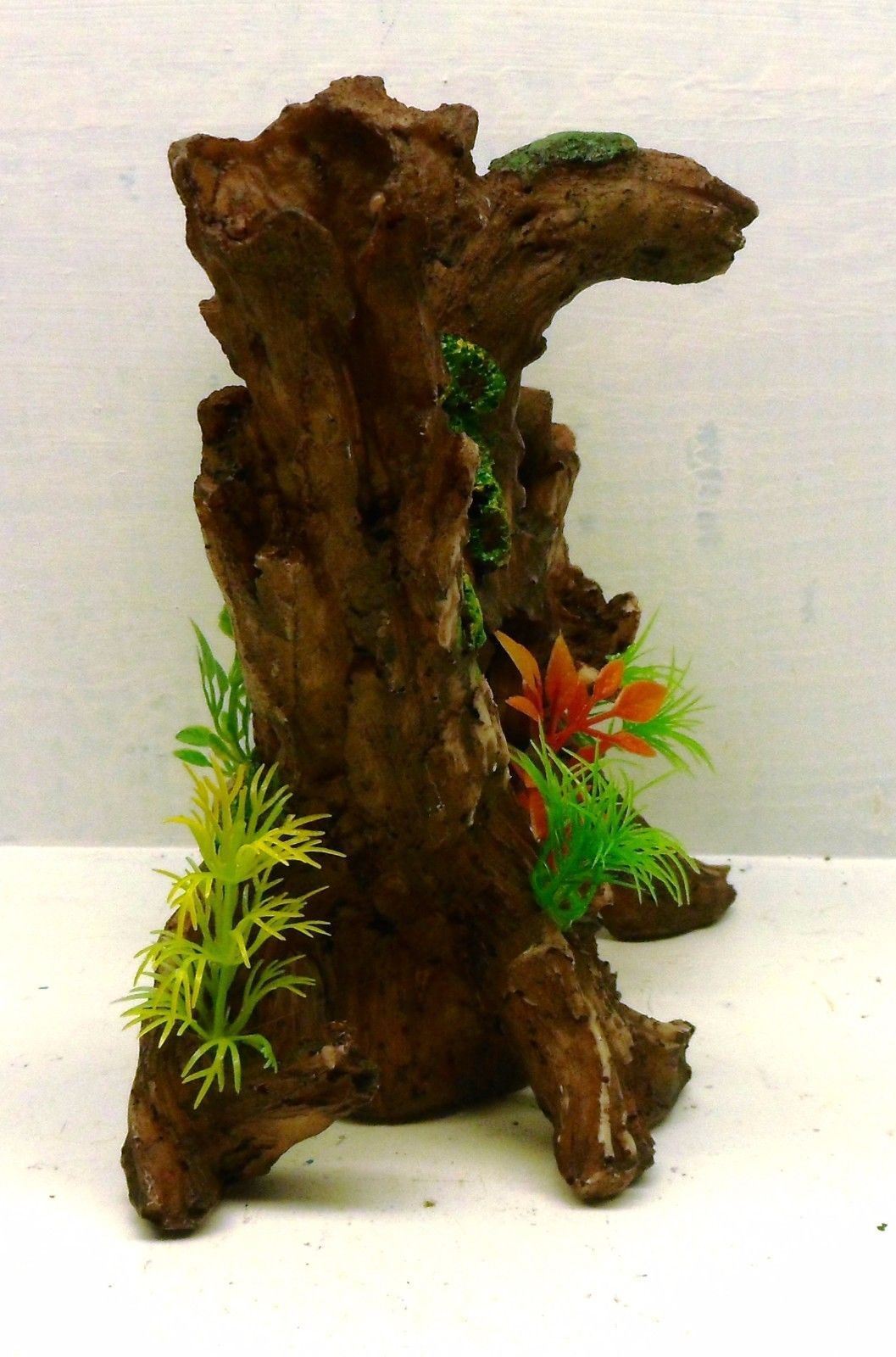TREE TRUNK BRANCH W/ PLASTIC PLANTS POLYRESIN REPLICA AQUARIUM ORNAMENT 3074