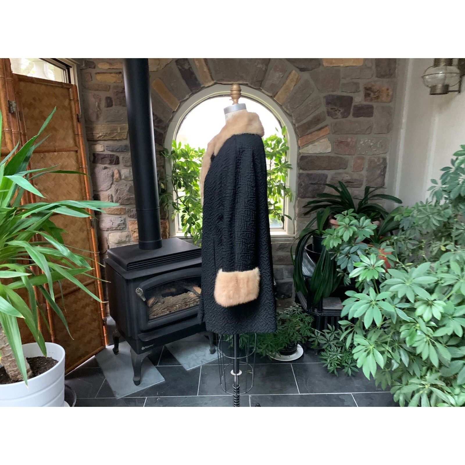 как выглядит Vintage 1950s Black Textured Wool Coat with Blonde Mink Collar and Cuffs фото