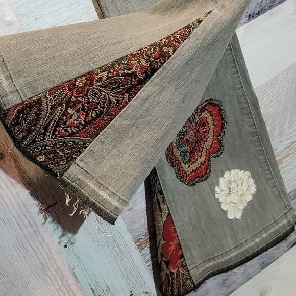 как выглядит Lucky Brand Gray Hippie Upcycled Tapestry Bell Bottom Flared Jeans Sz 6 фото