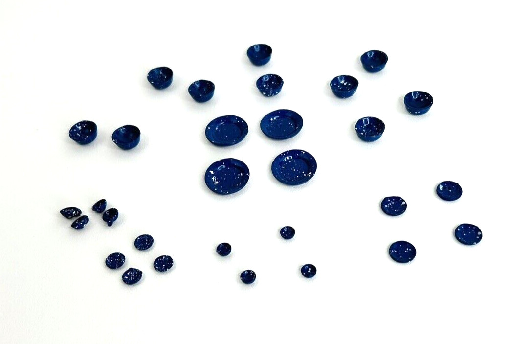 • Dollhouse Miniature Blue Speckled Enamelware Set 30 Pc. Dishes Bowls Cups Set