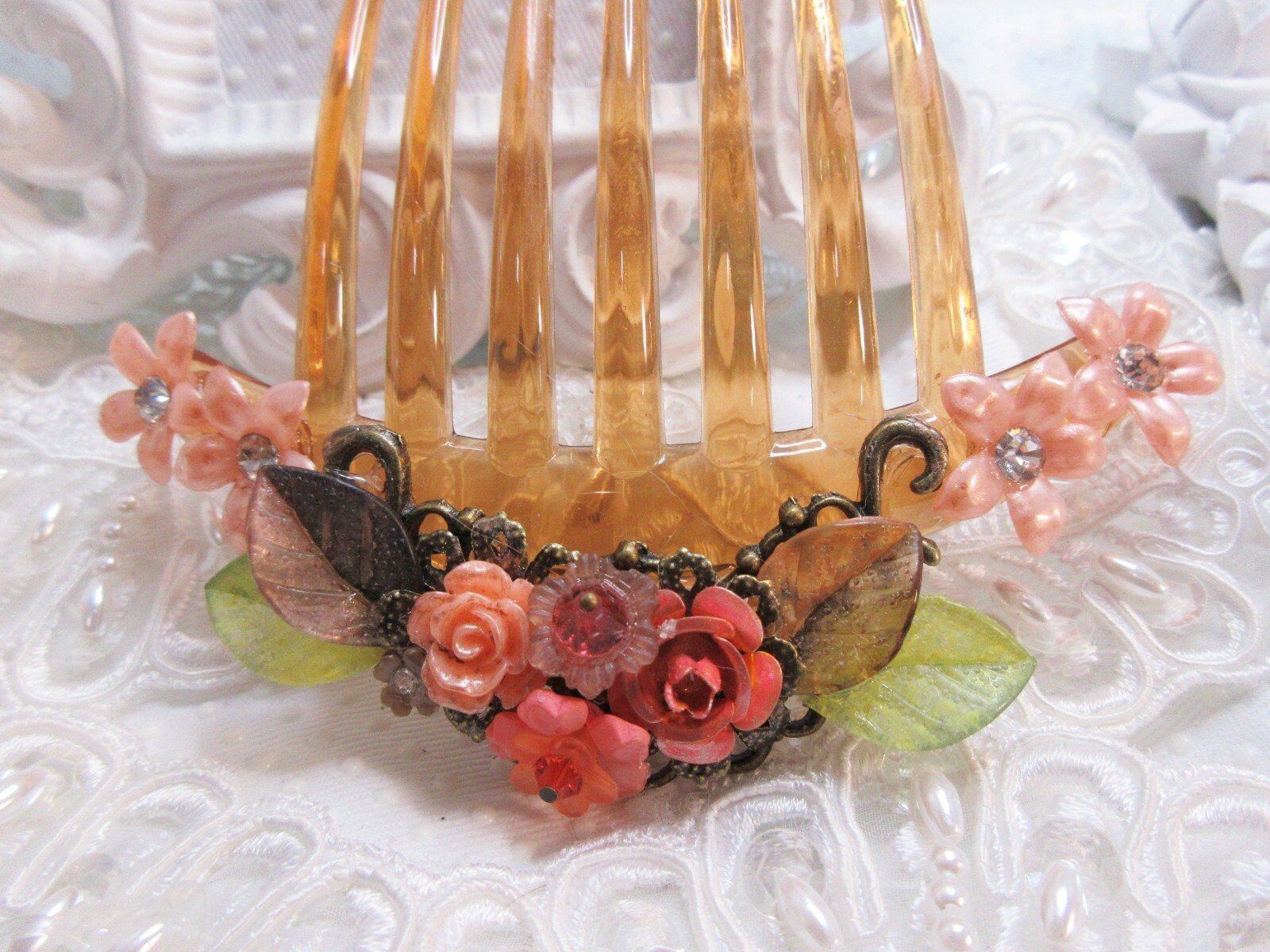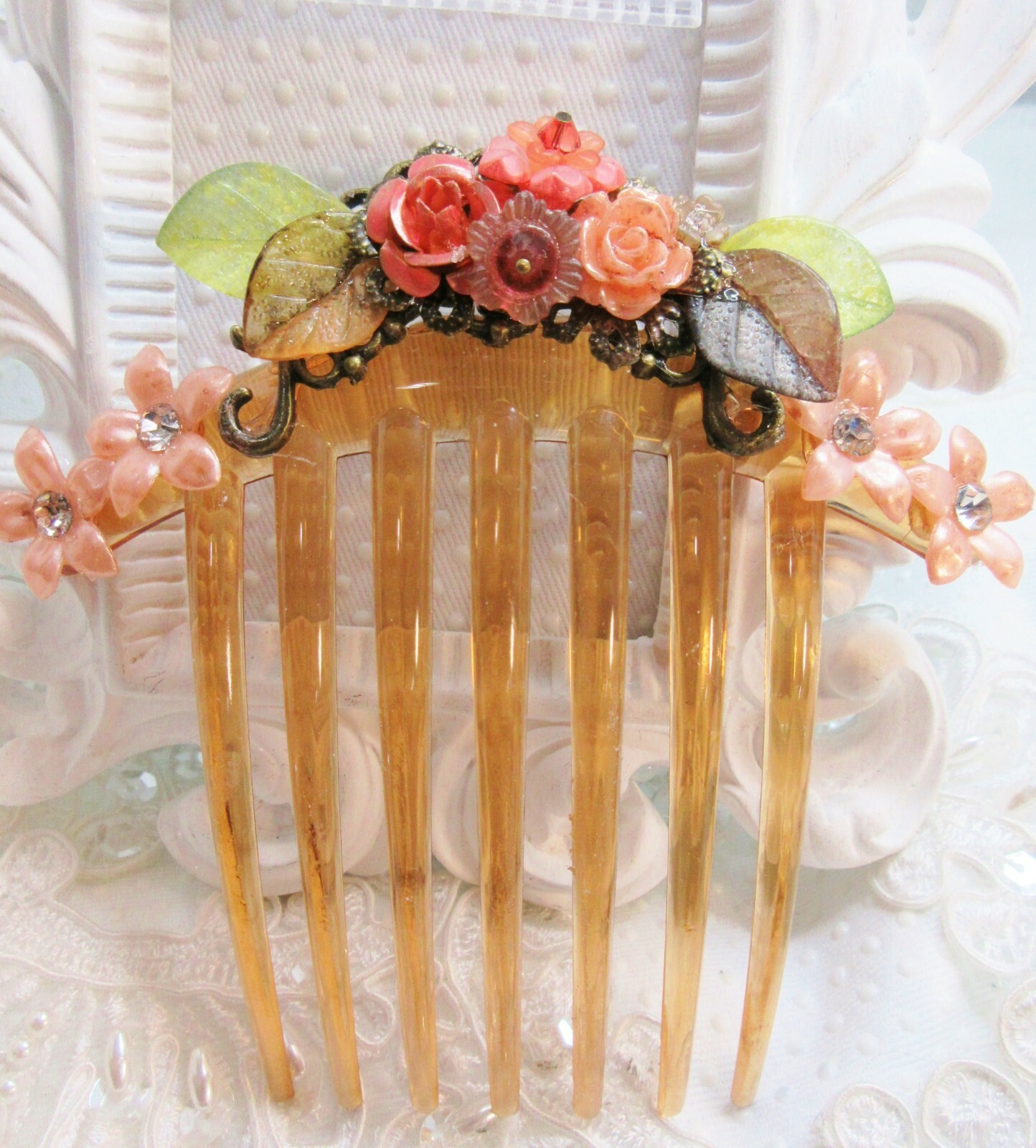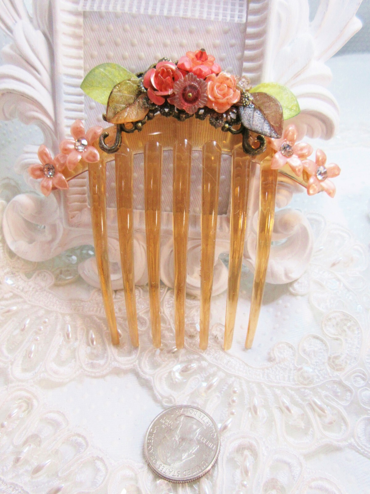 Vintage Romantic Lucite Artisan hand painted flowers French Hair comb, Wedding
