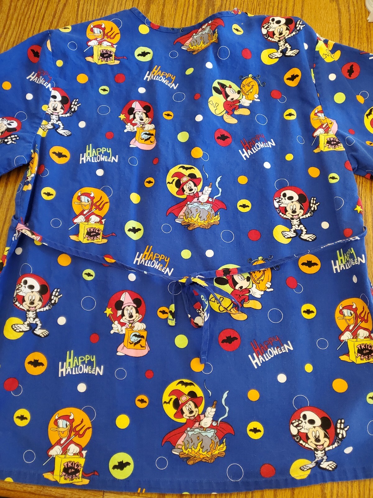 Disney Halloween Scrub Top Medium EUC Blue With Mickey/Donald/Minnie