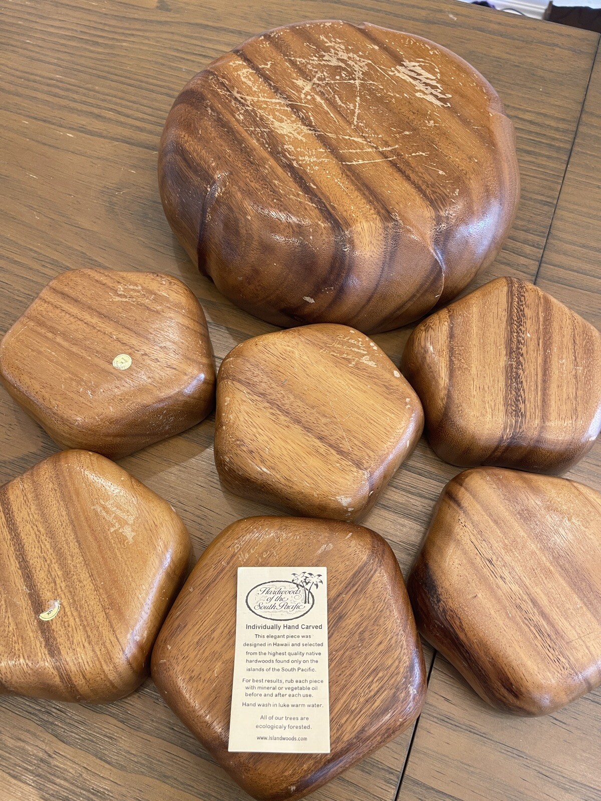 • INDIVIDUALLY HAND CARVED WOOD BOWL set signed Nine pieces