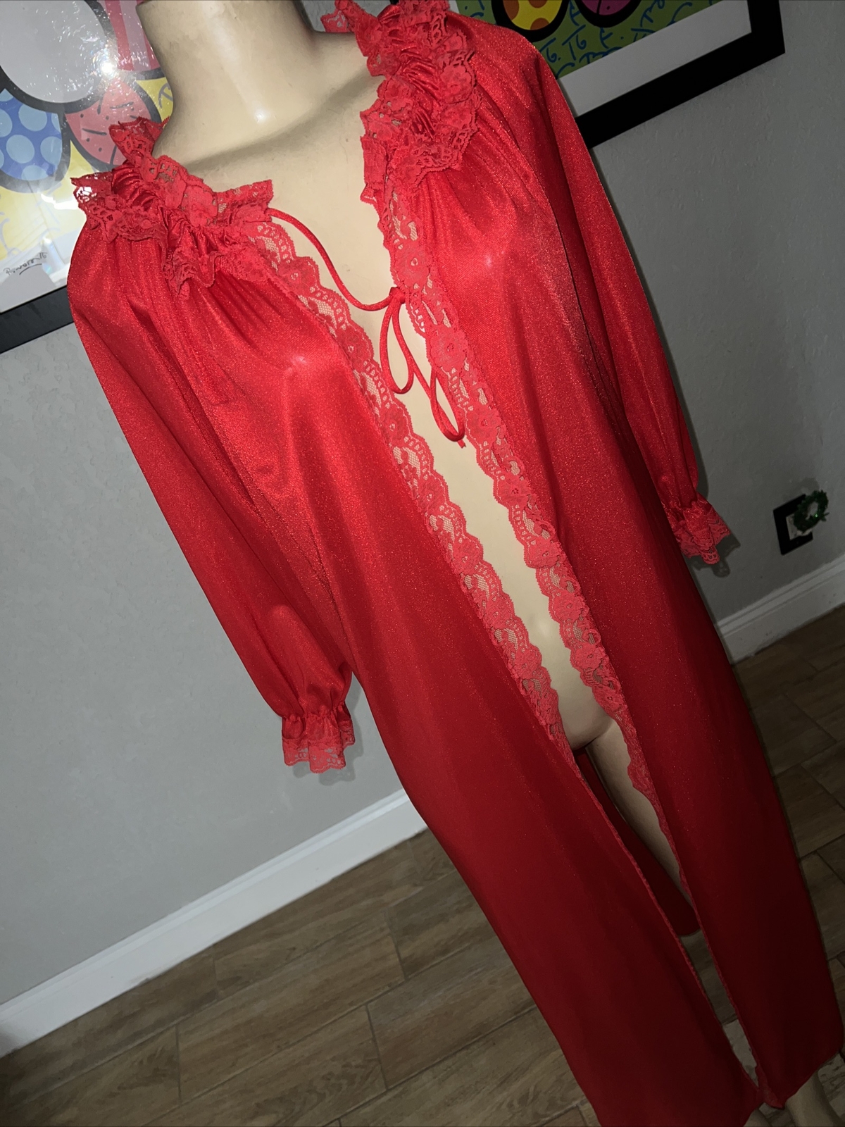 Antique Style Red Gown Robe Peignoir Robe Ruffled Lace Trim Tie Top Sm cbh