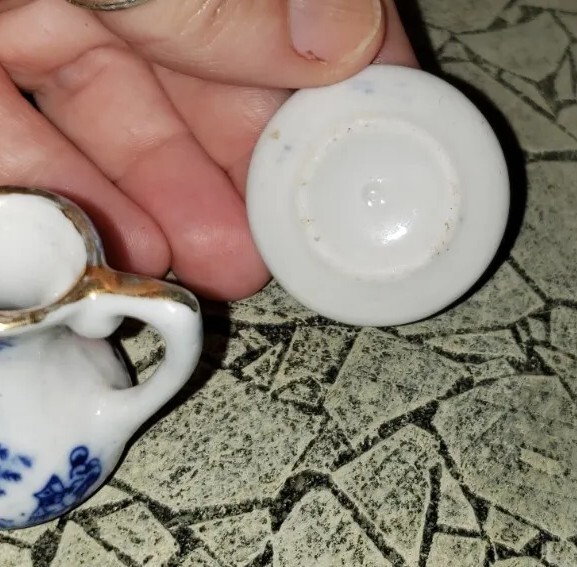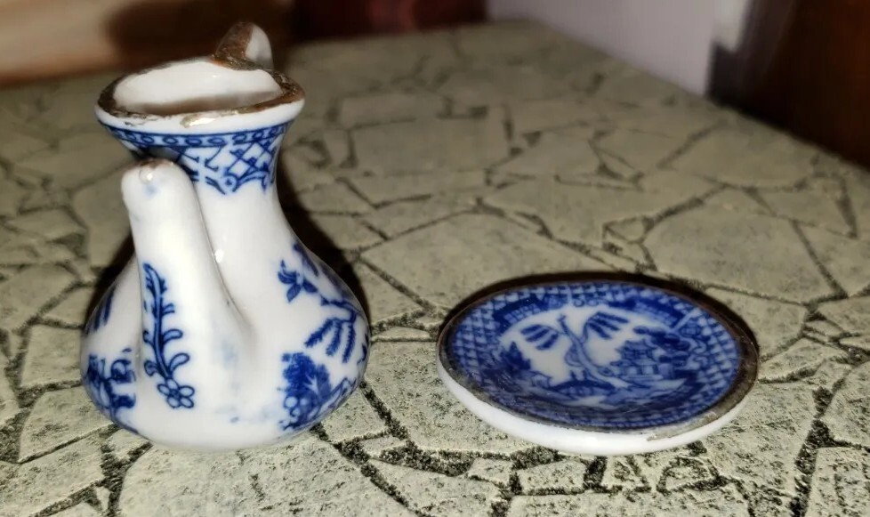 Vintage Miniature Blue Willow Tea Pot Saucer Blue White China Crane
