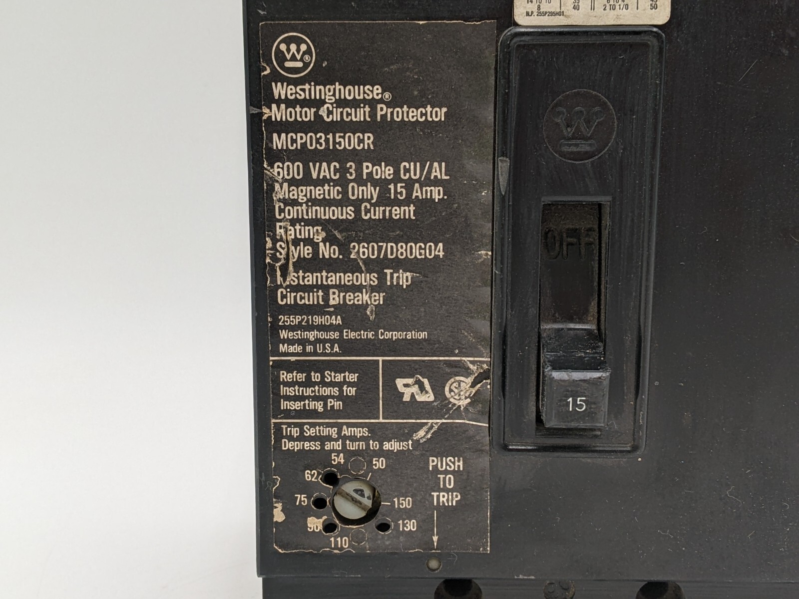 Westinghouse MCP03150CR Circuit Breaker 15 Amp 3 Pole 600 VAC Instantaneous Trip