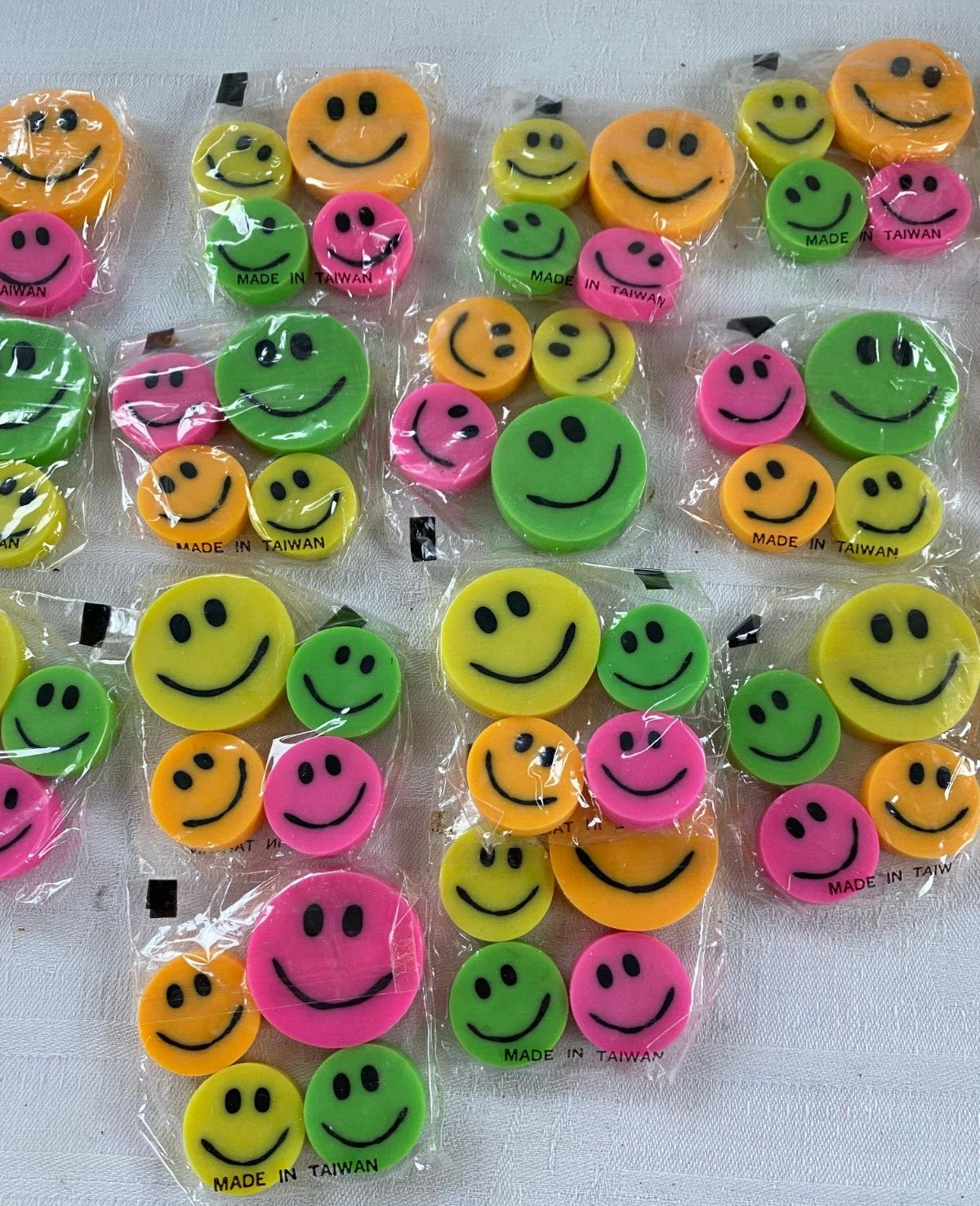 Lot of 112 Mini Smiley Face Erasers in Packages of 4 - Rewards Give Aways - NOS