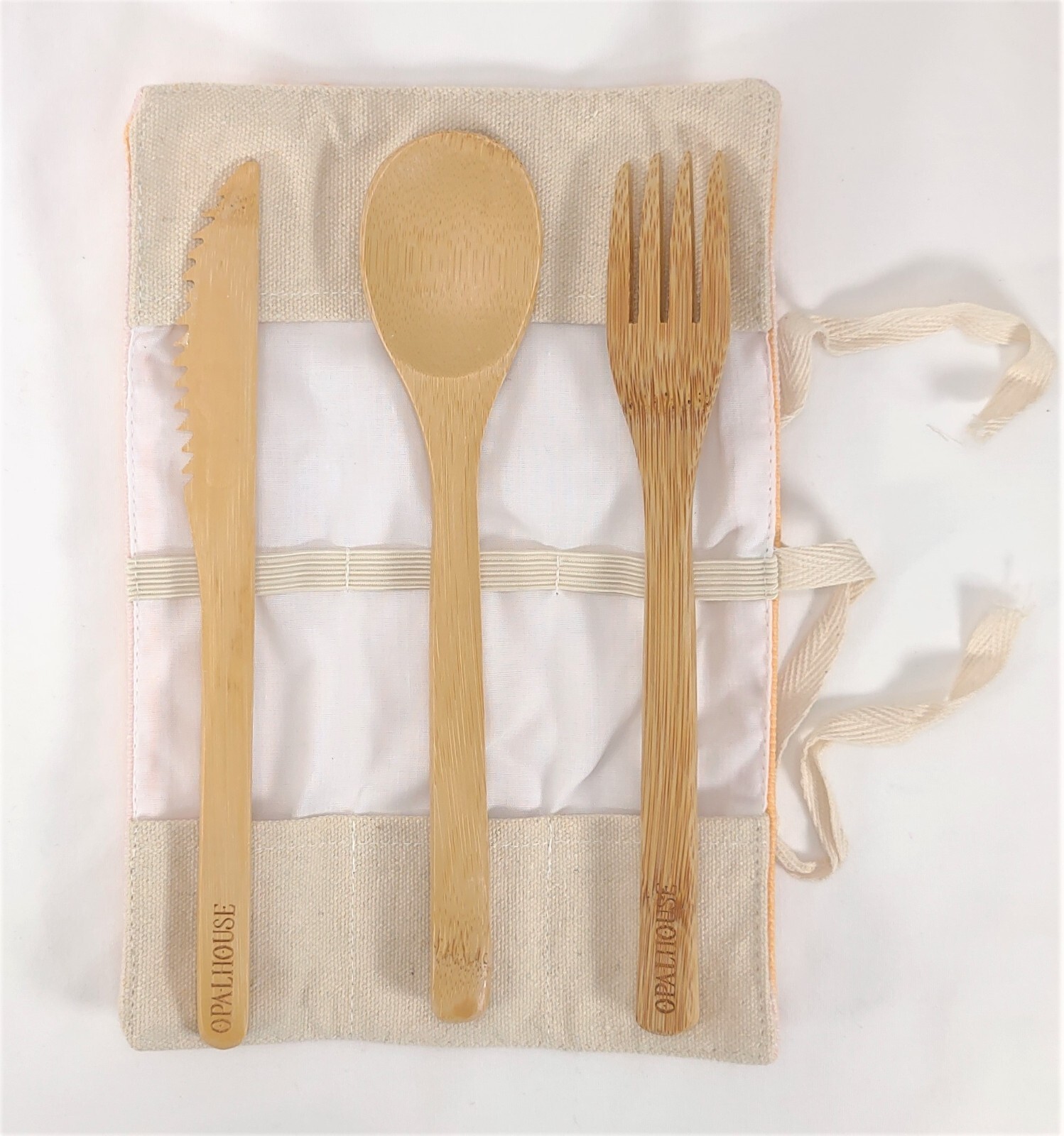 Lot of 4 Reusable Bamboo Utensil 4 pc sets Spoon Fork Knife carry Pouch Cutlery