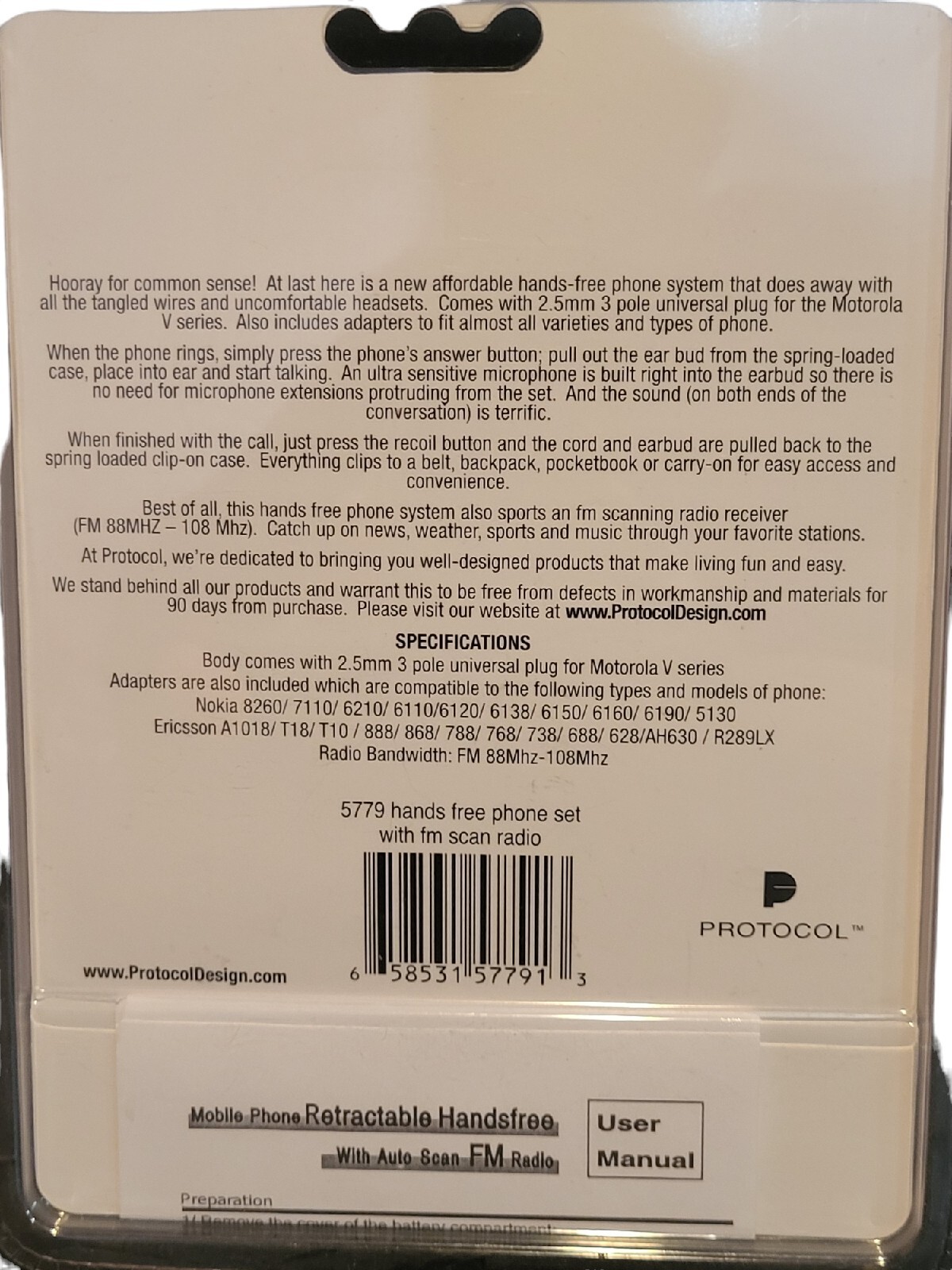 Protocol Hands Free Phone Set w/ FM Scan Radio Earbud has Built In Microphone