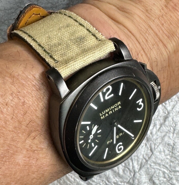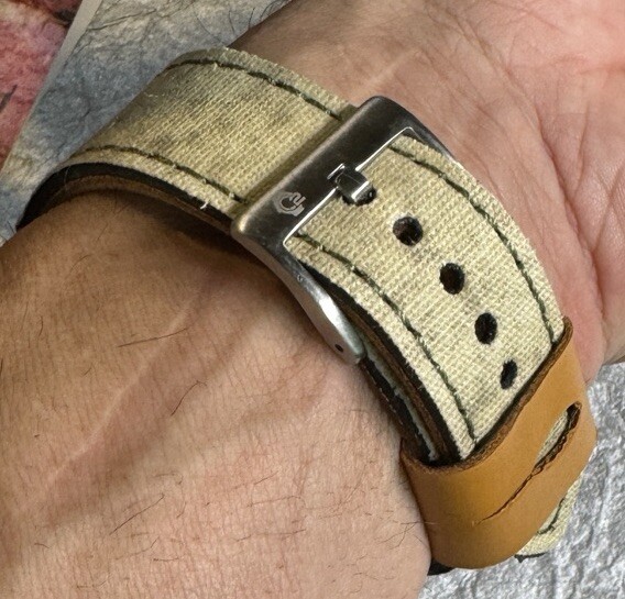 как выглядит 24mm Yellowish Canvas/Leather watch Strap Bell Ross Br01 Br03 Green Stitch фото