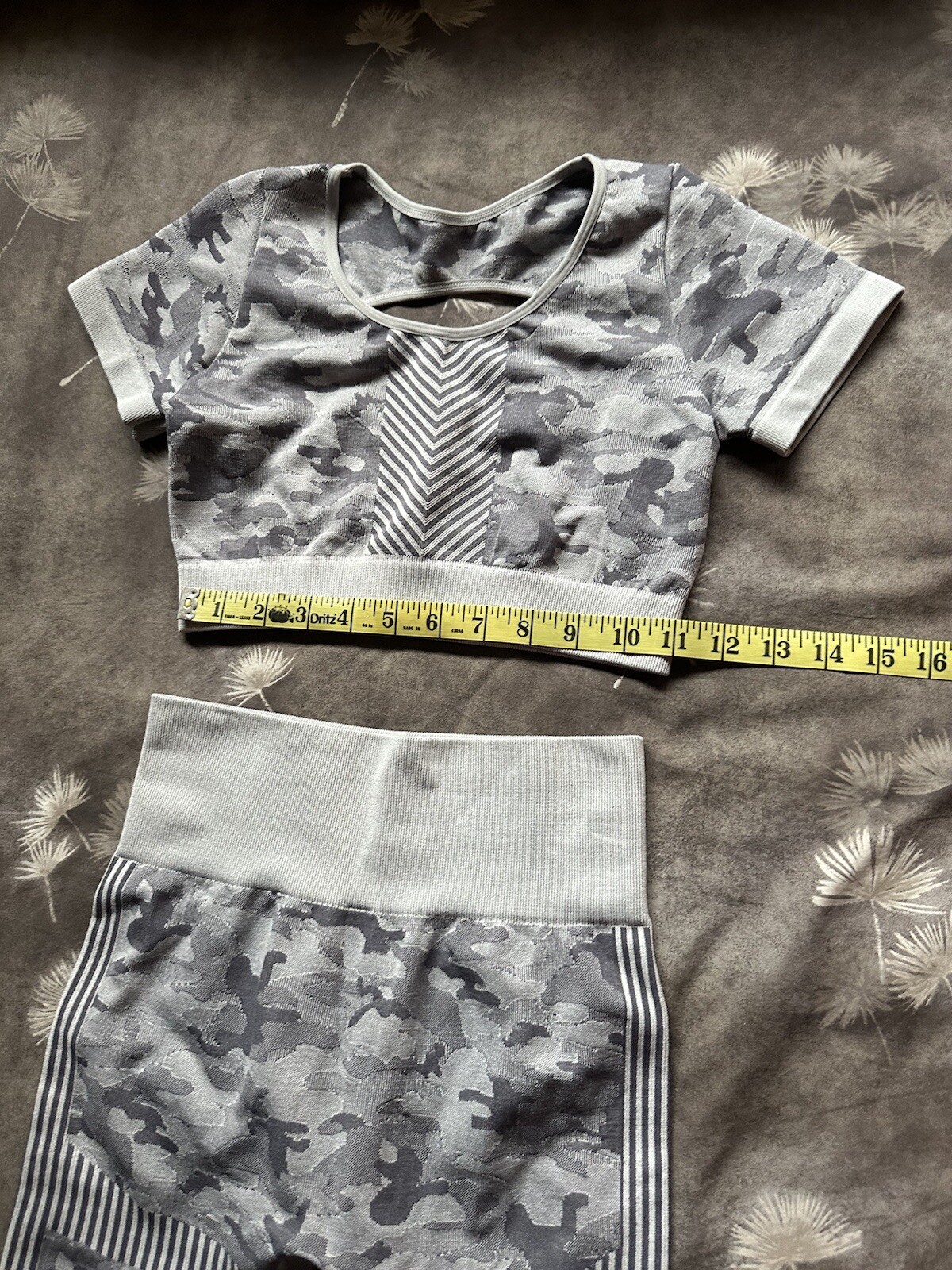 как выглядит 2 piece workout set grey stripes and camo Size Small Crop Top And Leggings фото