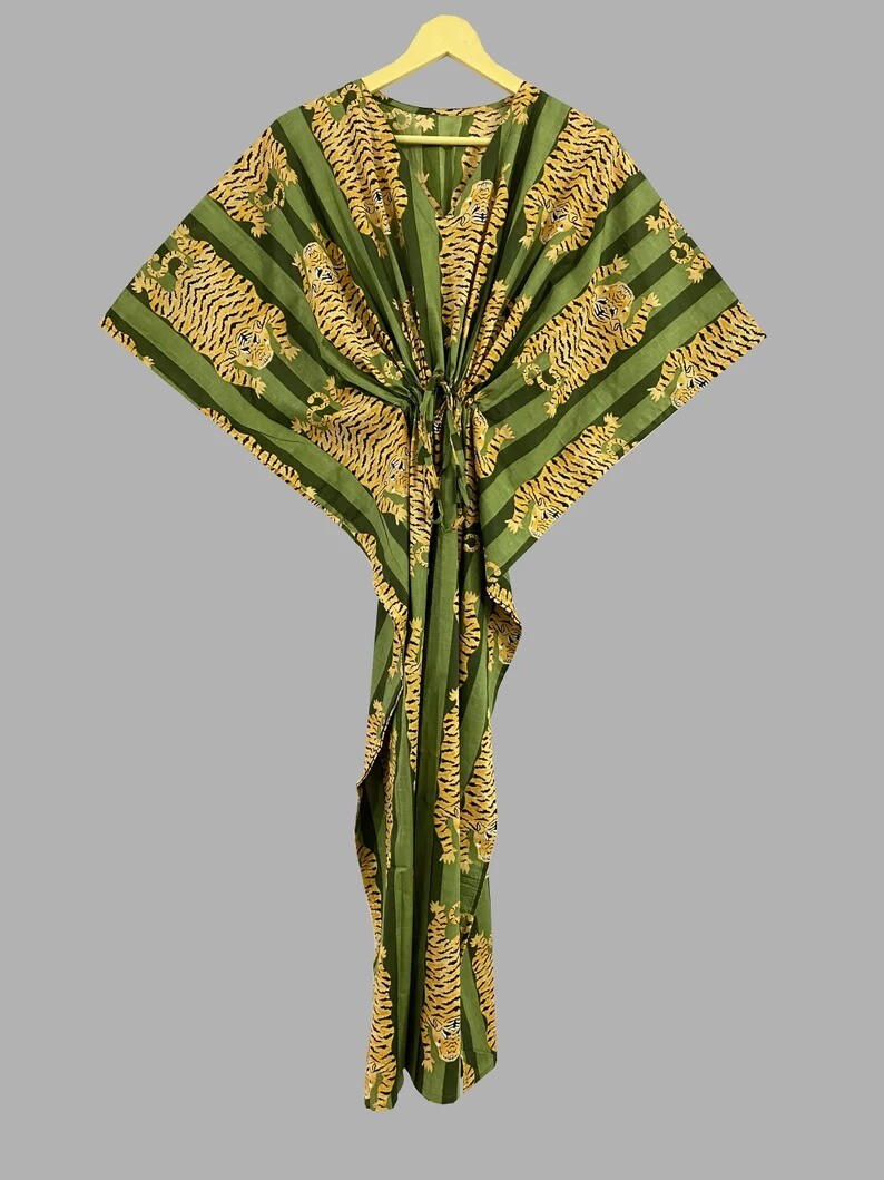 как выглядит Dark Green Indian Large Tiger 100 Cotton Kaftan Dress Night Maxi Dress Gown US фото