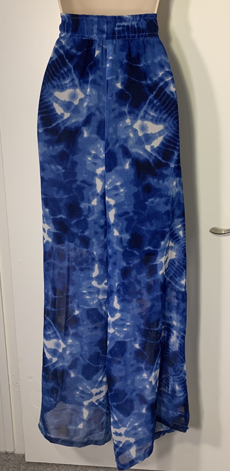 Women s Vintage Retro Boho Blue Tie Dye Sheer Chiffon Palazzo Pants, Size L