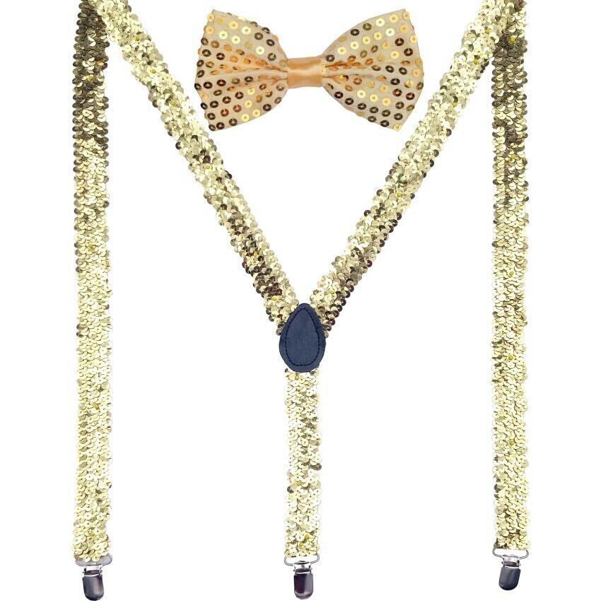 Men AB Elastic Band Gold Sequin Suspender With Maching Polyester Bowtie