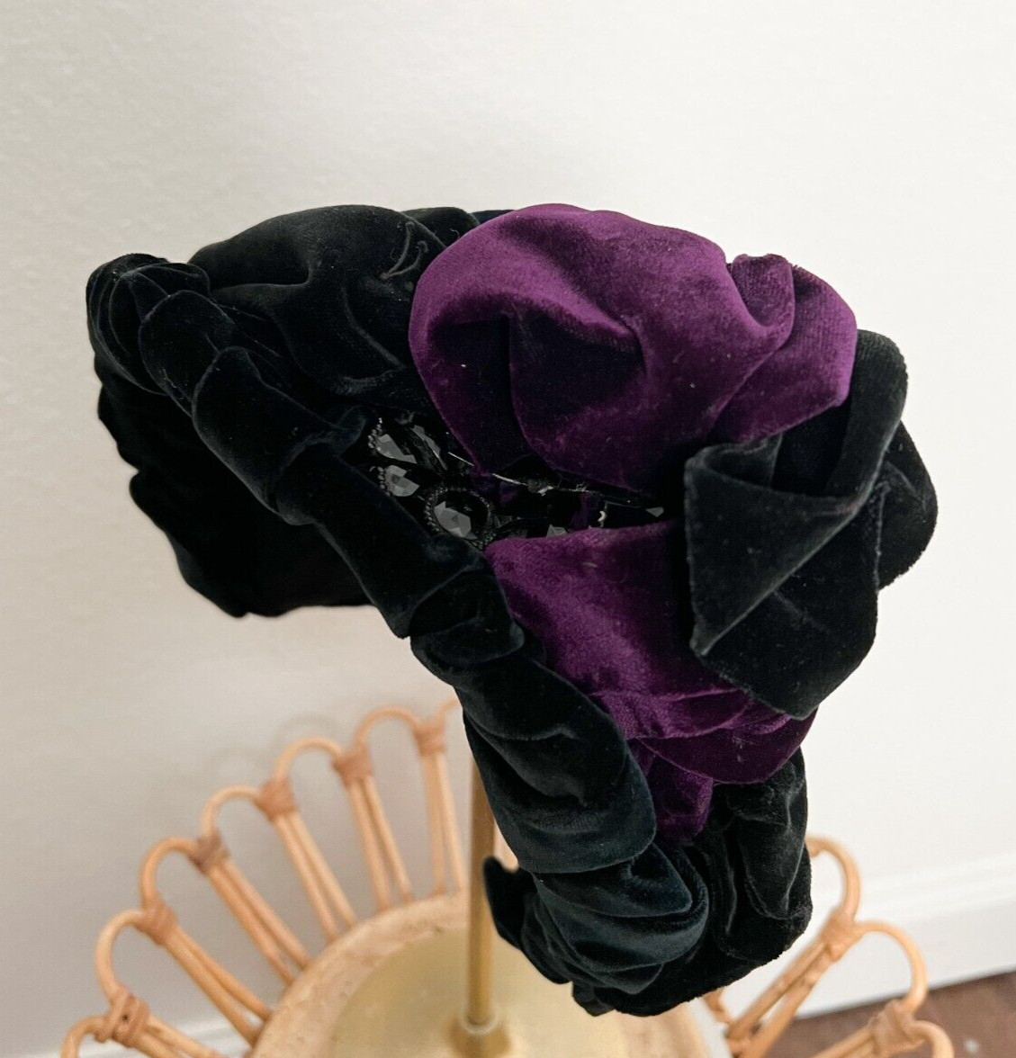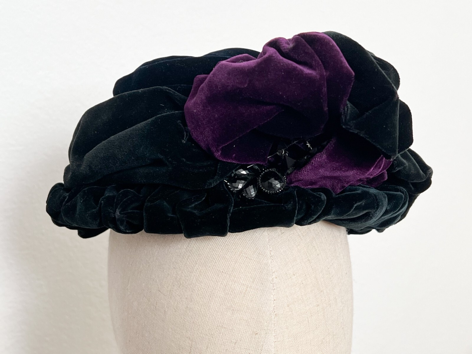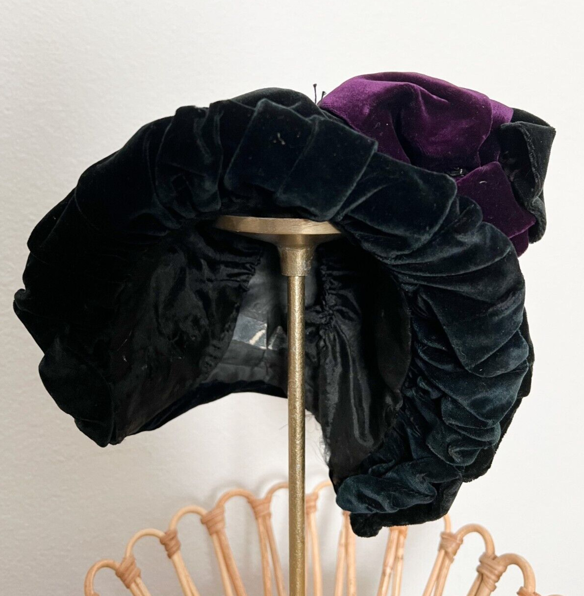 Antique 1800s Victorian Black Purple Velvet Bonnet Hat w/ Beaded Trim