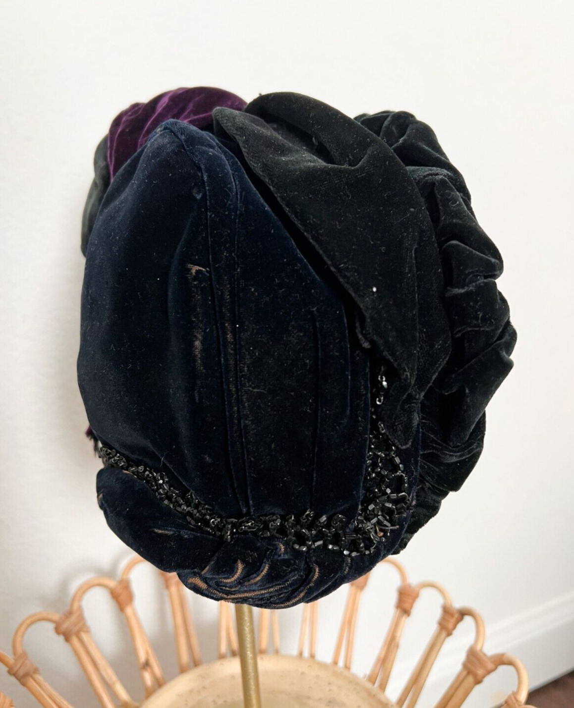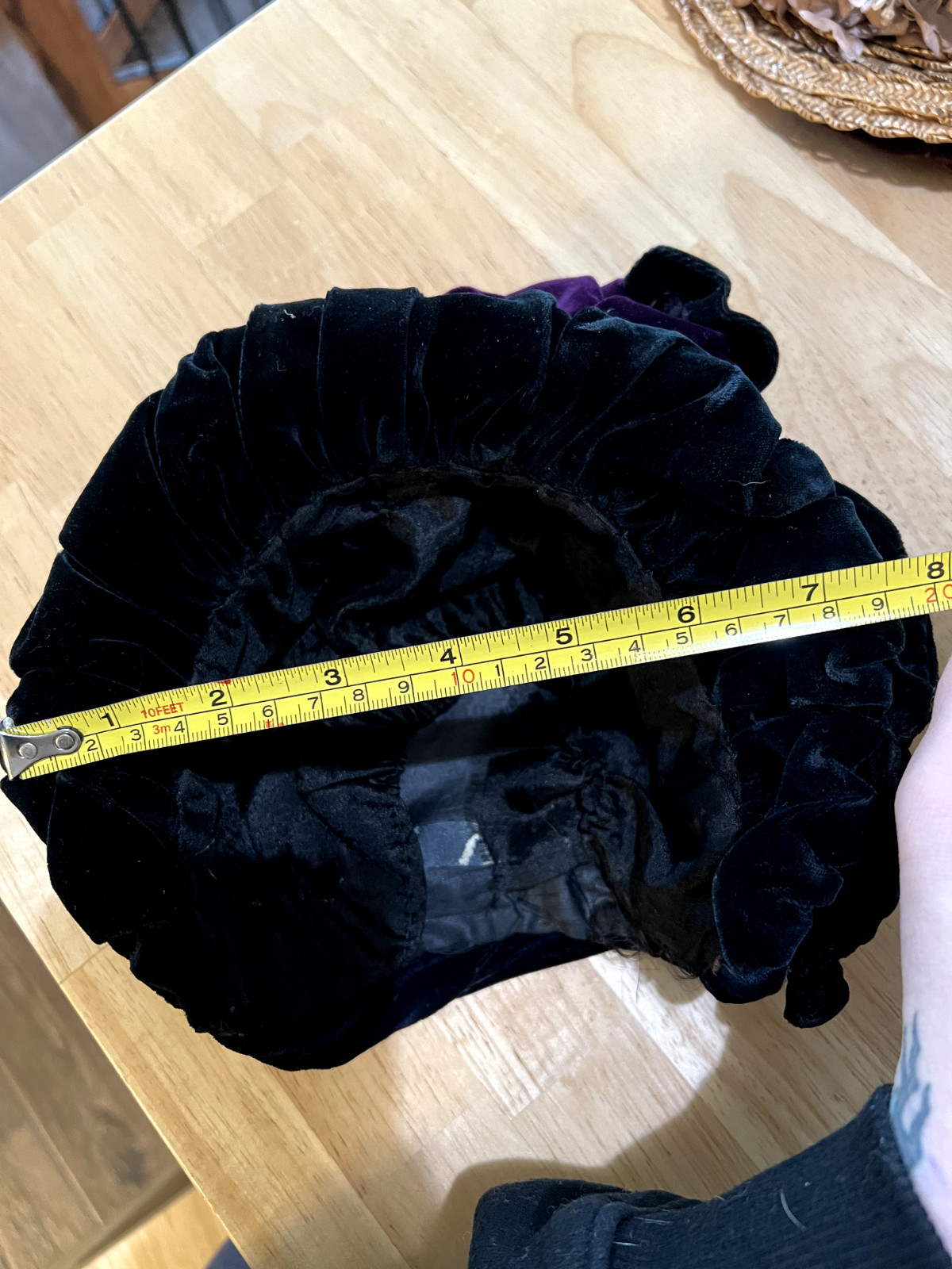как выглядит Antique 1800s Victorian Black Purple Velvet Bonnet Hat w/ Beaded Trim фото