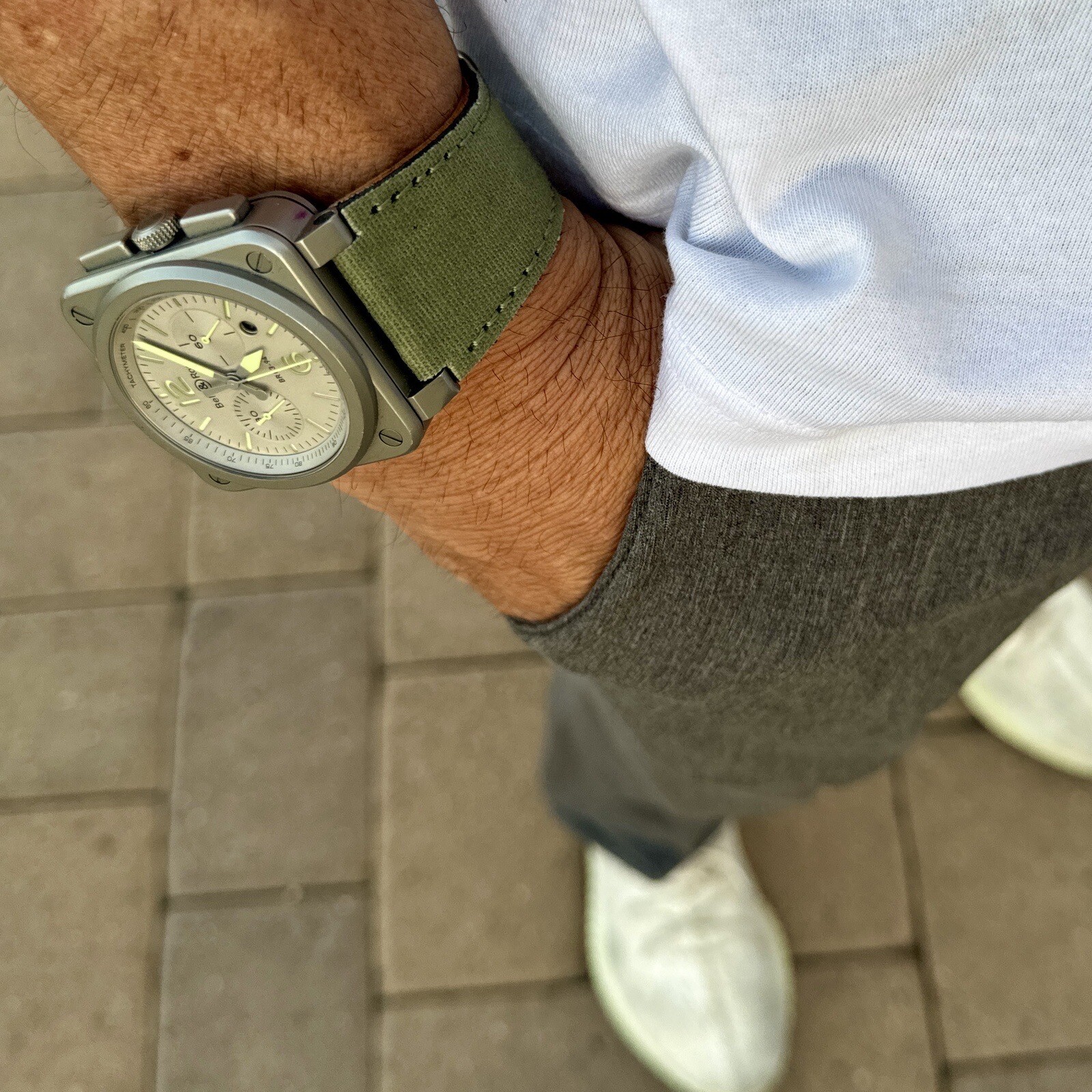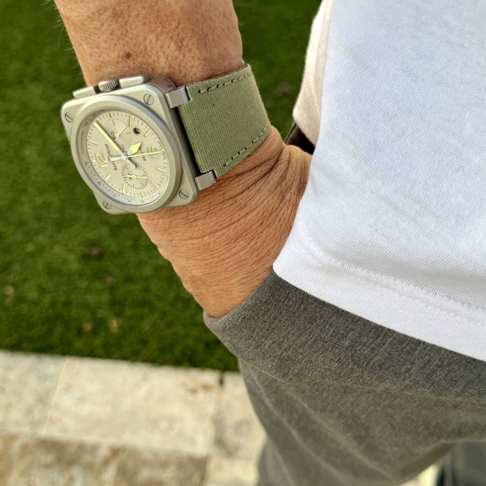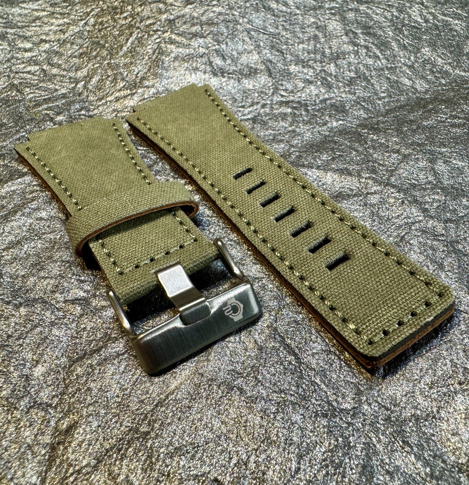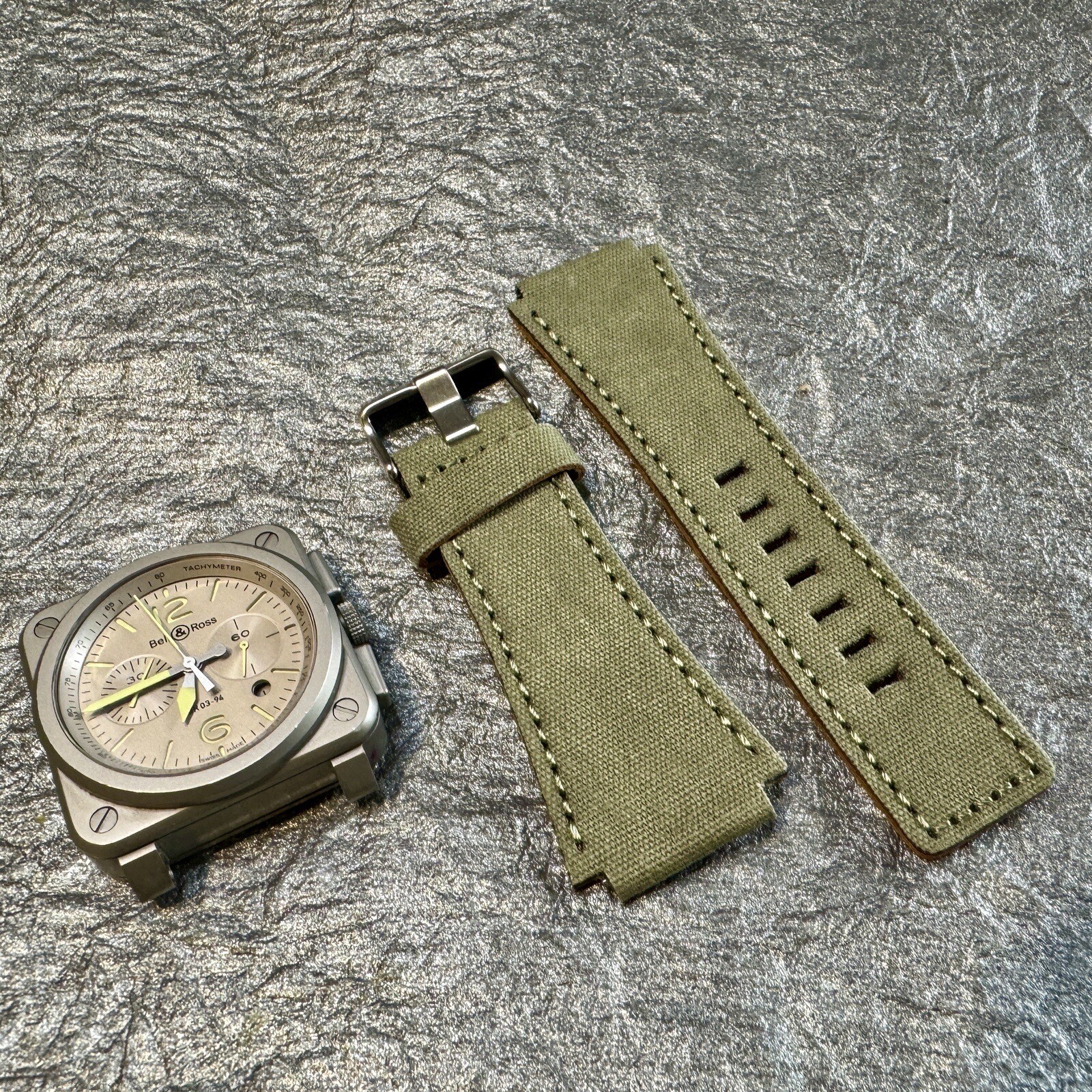 24mm Green Canvas/Leather watch Strap Bell Ross Br01 Br03 Green Stitch
