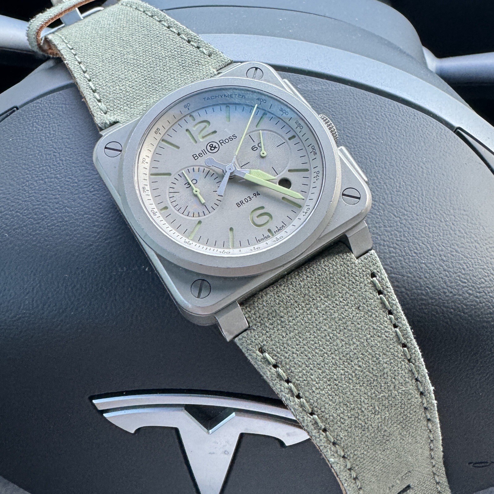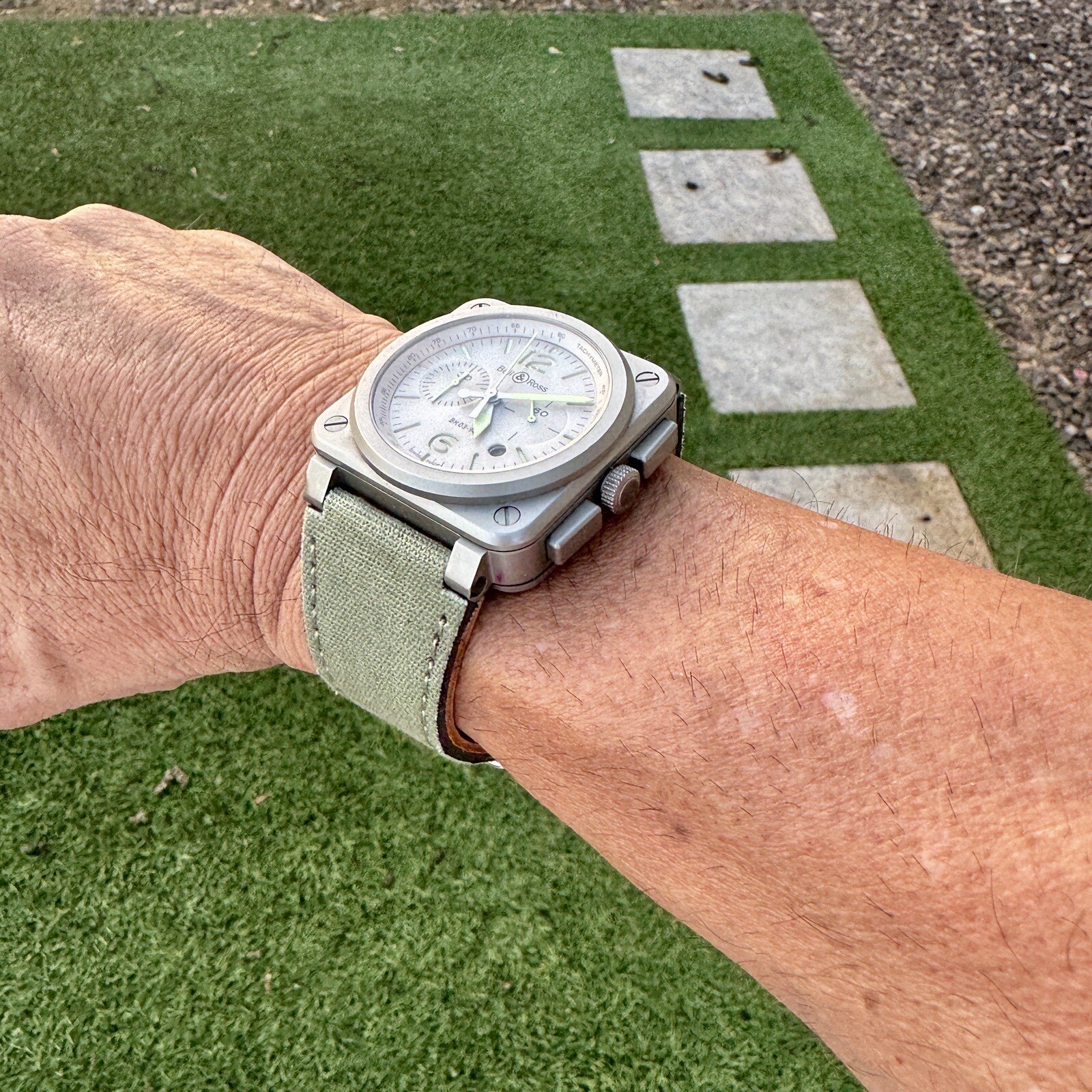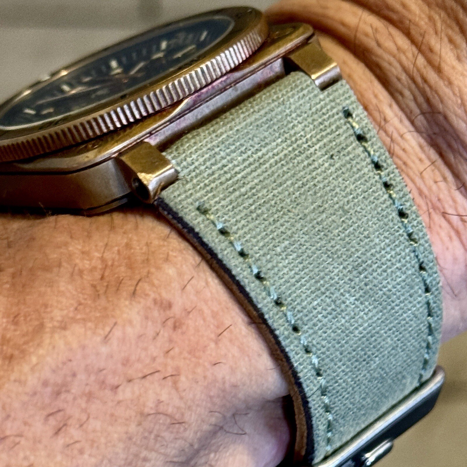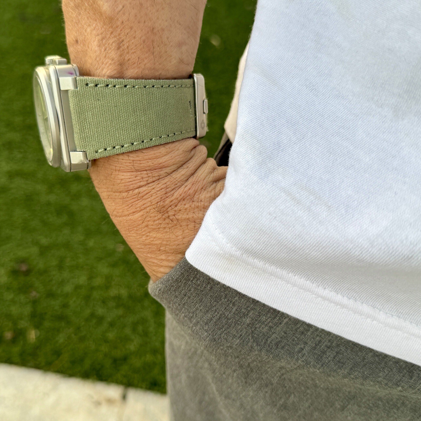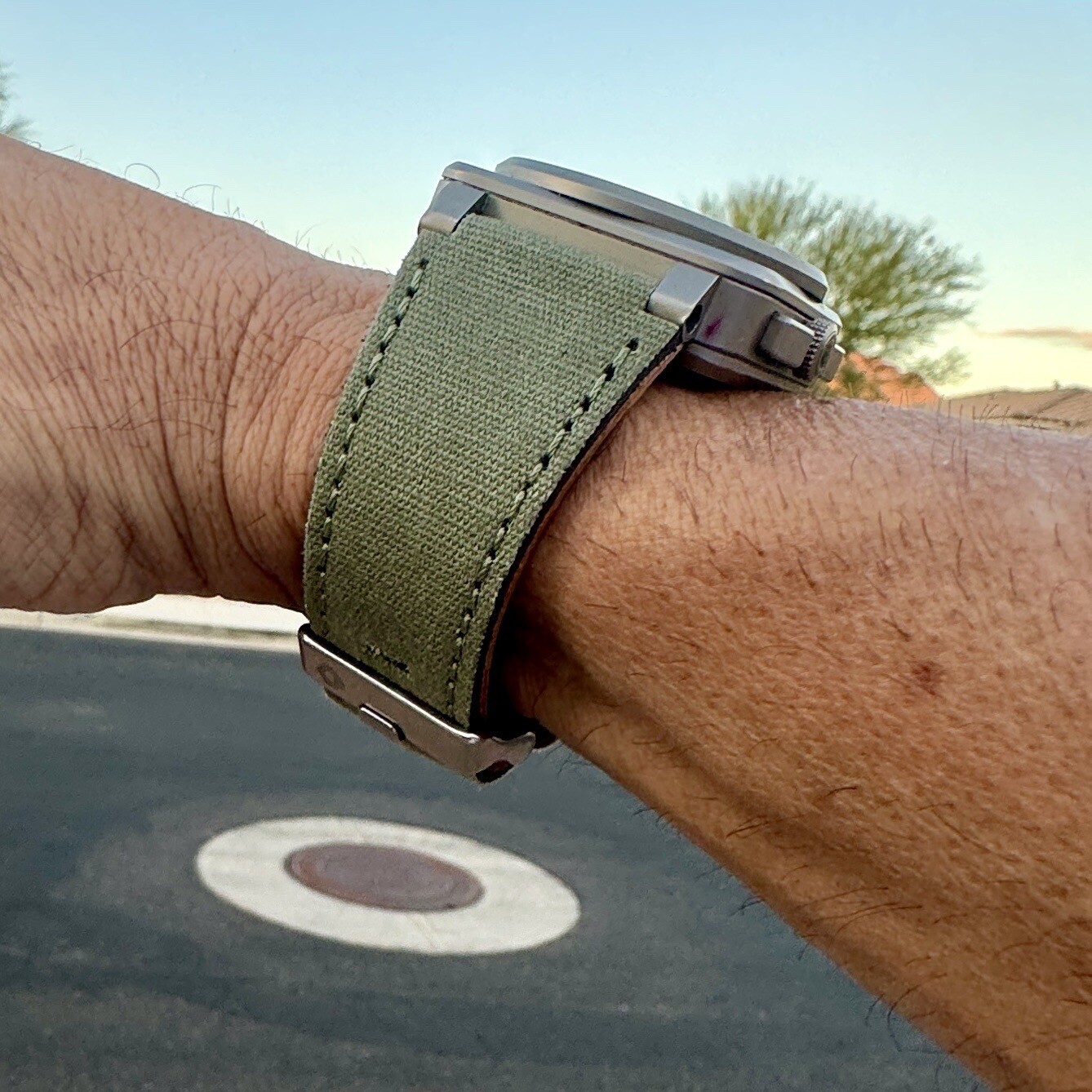24mm Green Canvas/Leather watch Strap Bell Ross Br01 Br03 Green Stitch
