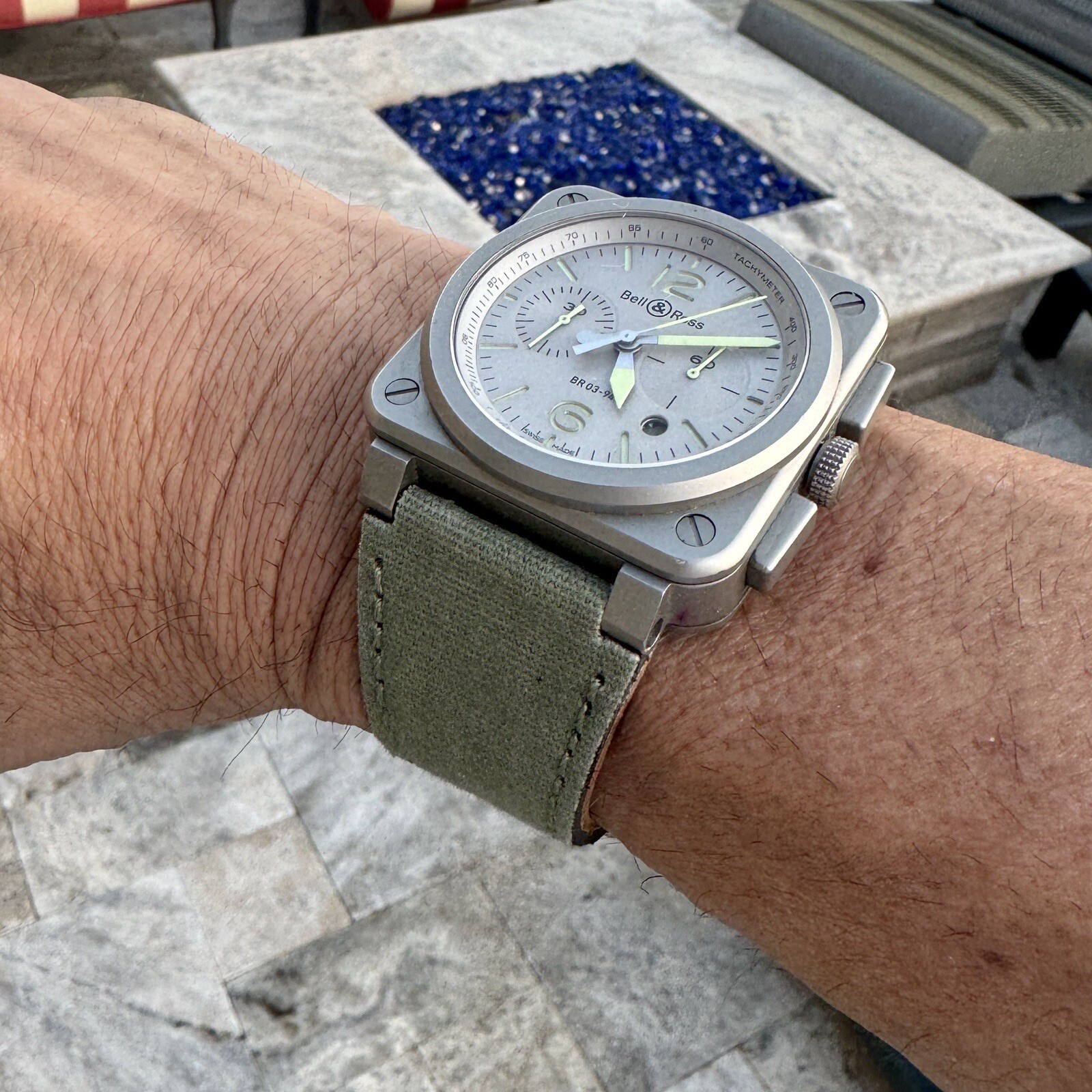 как выглядит 24mm Green Canvas/Leather watch Strap Bell Ross Br01 Br03 Green Stitch фото