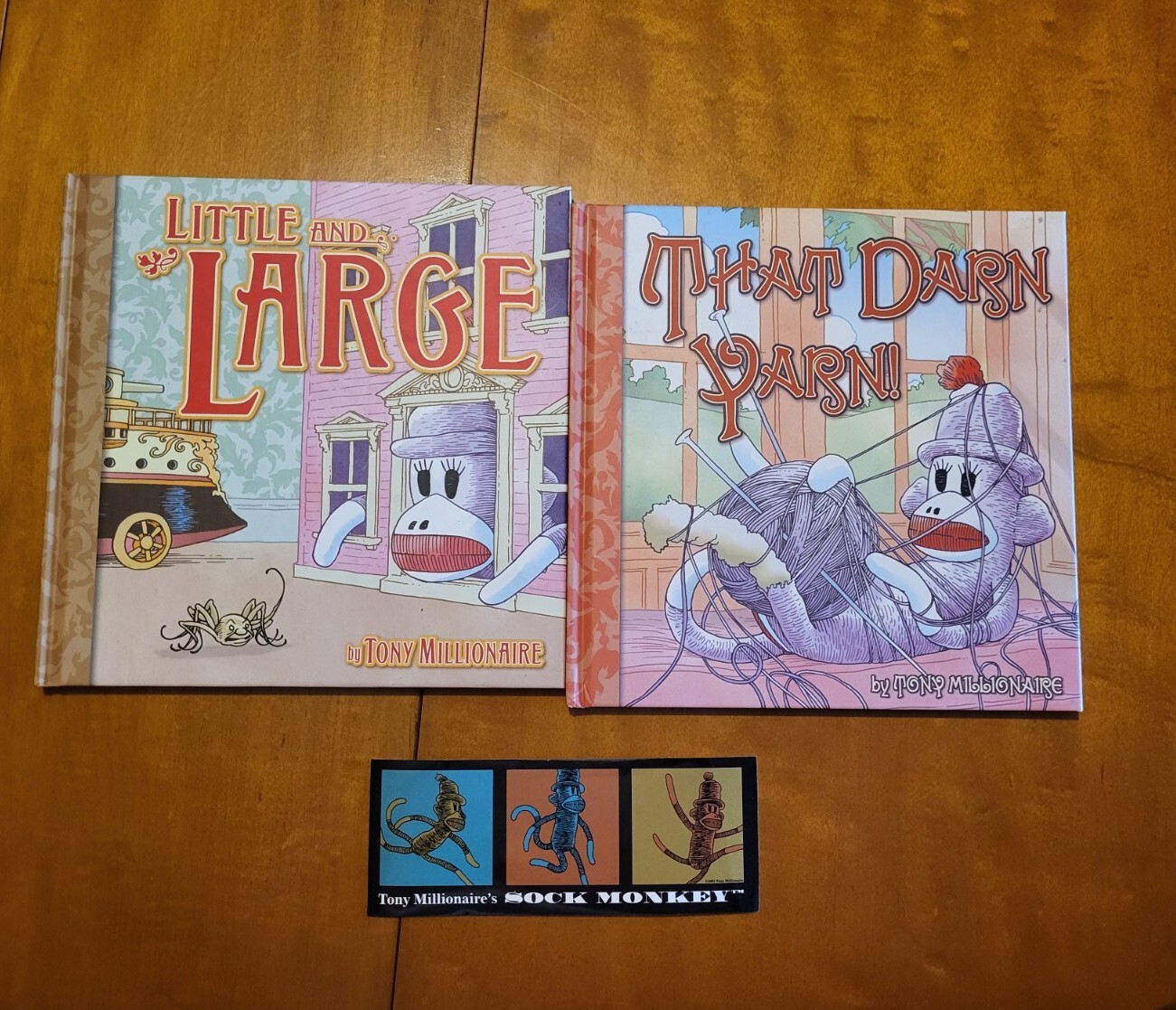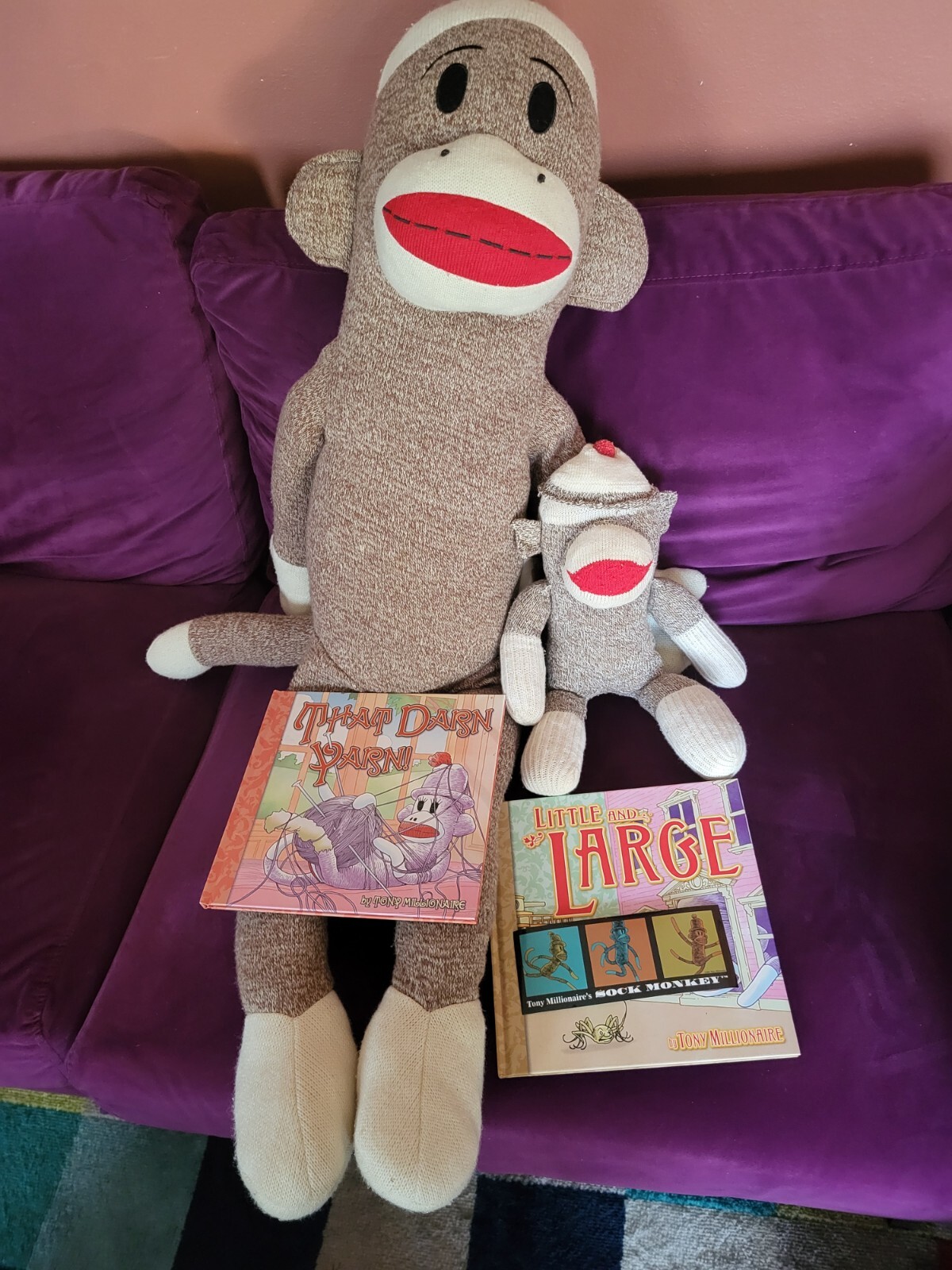 как выглядит 2011 Maxx The Sock Monkey 40" Plush, 2 BOOKS, 1 STICKER 1 Vintage Monkey Lot фото