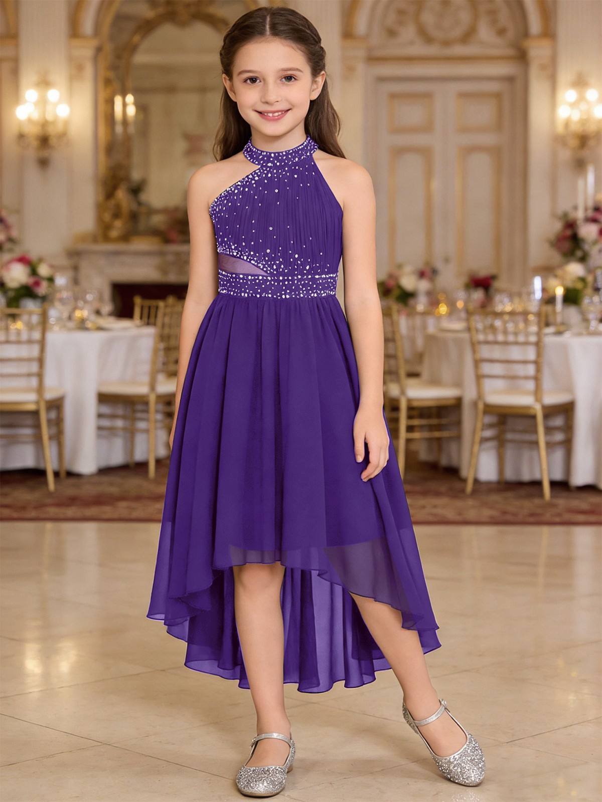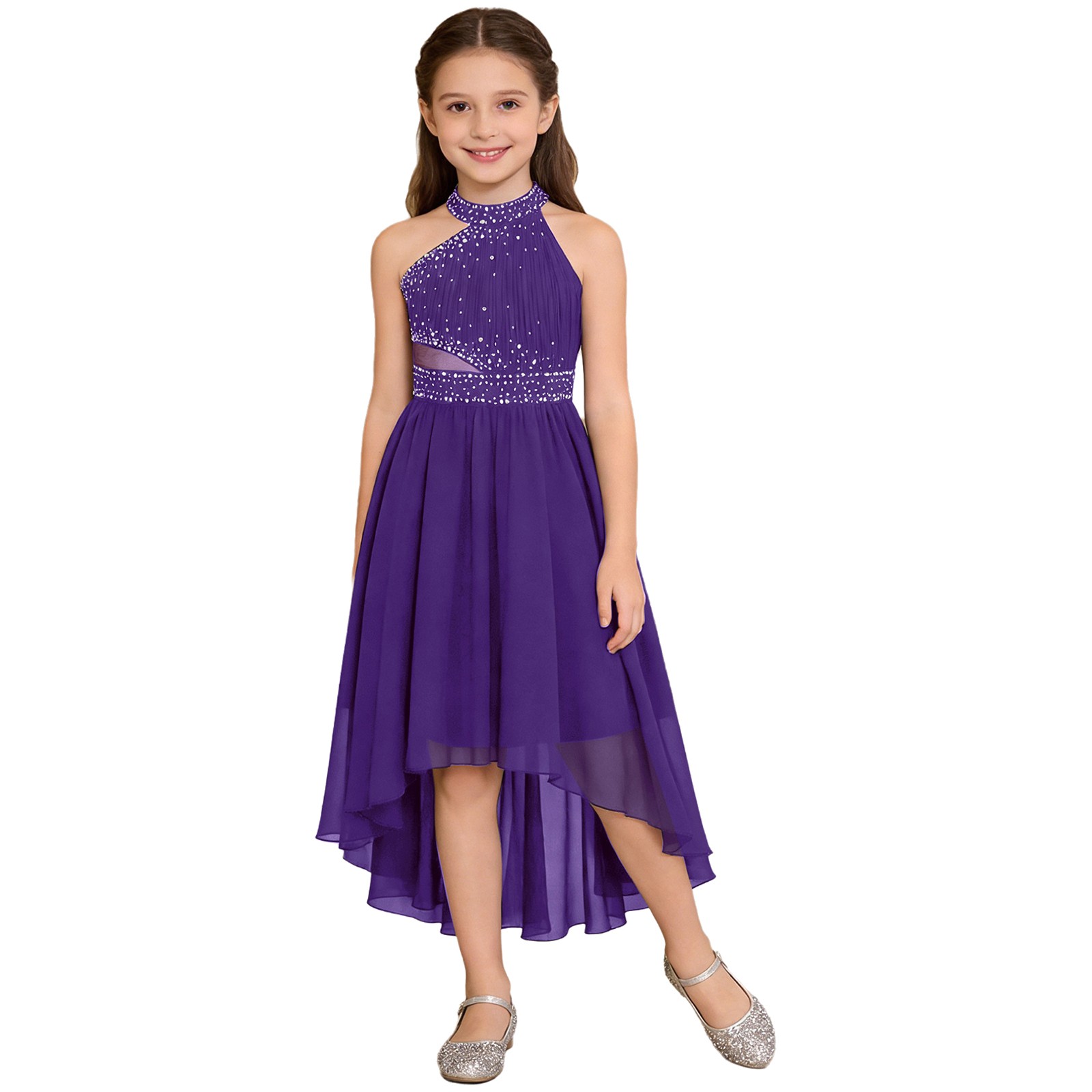 как выглядит Kids Girls Dress Sleeveless Dance Party Bridesmaid Shiny Costumes Asymmetrical фото