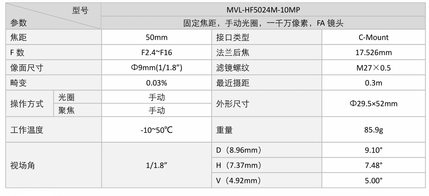 HIKROBOT Industrial Camera Lens MVL-HF5024M-10MP C-Mount 10MP 1/1.8 50mm