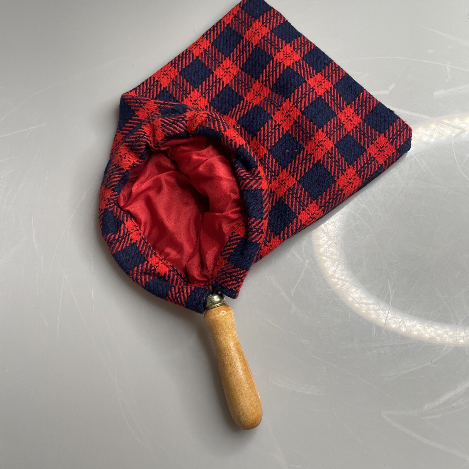 как выглядит Vintage Church Tithe Offering Collection Red Blue Cloth Bag Wooden Handle фото