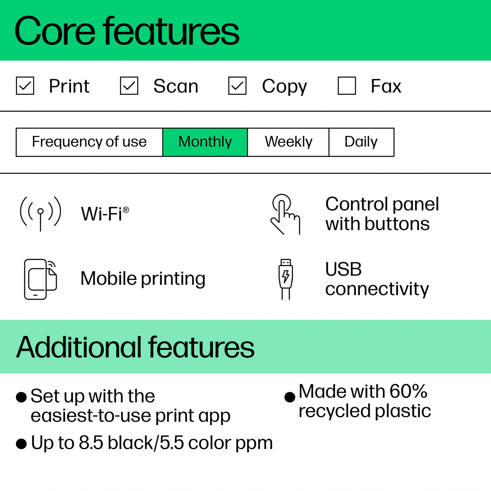 Connectivity: 1 Wi-Fi 802.11b/g/n; 1 Hi-Speed USB 2.0 (device)