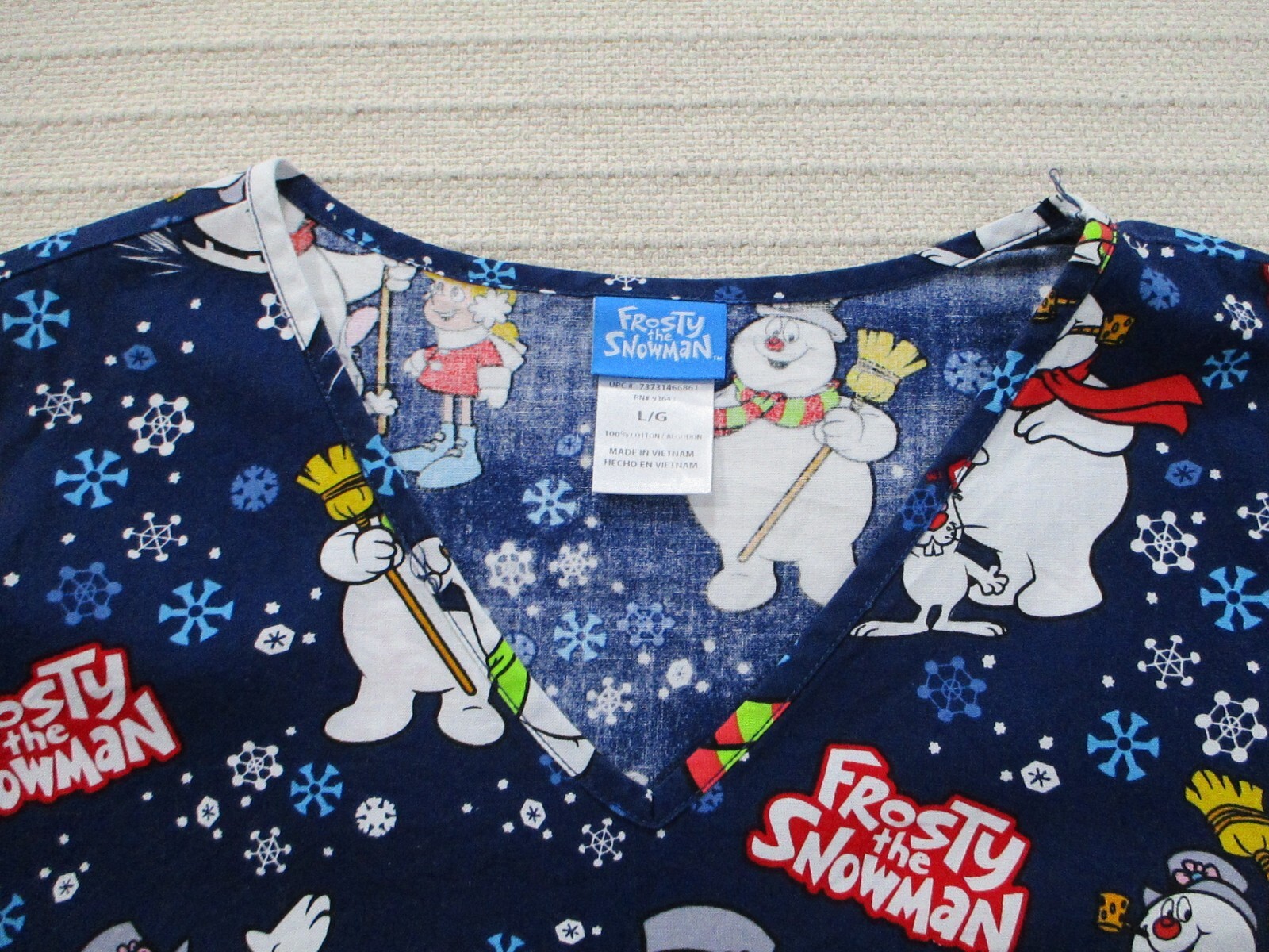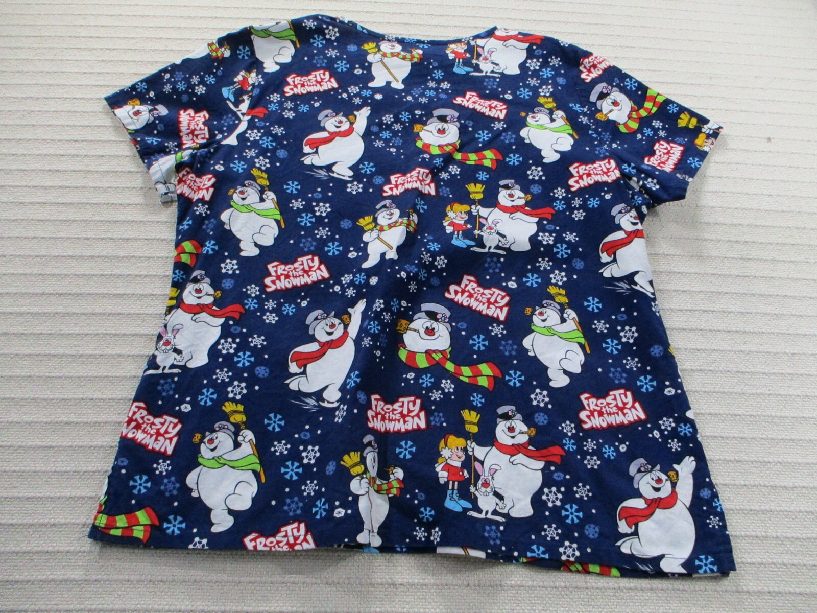 как выглядит Frosty Snowman Women Scrub Shirt Large Blue Graphic Short Sleeve Neck Pocket фото