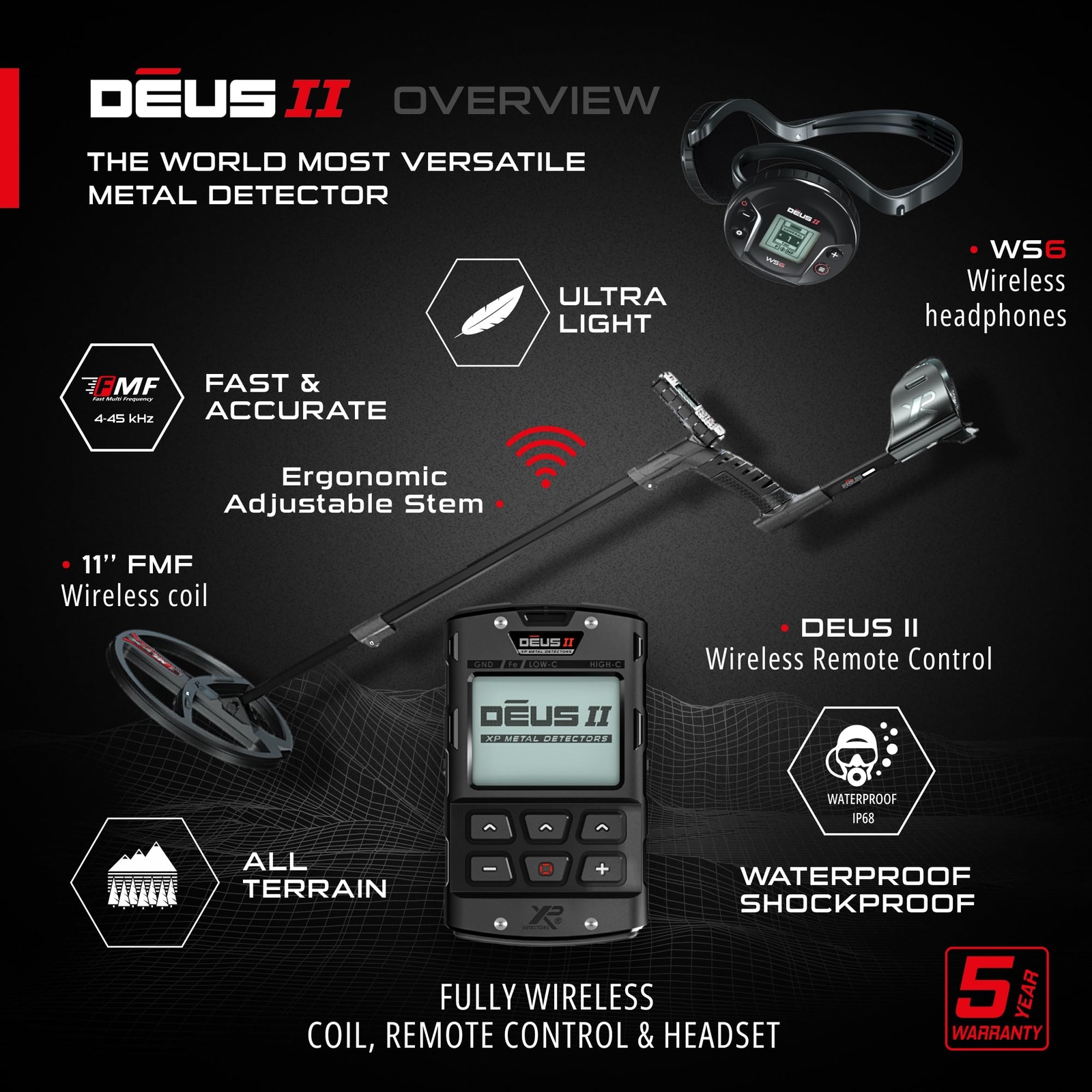 Deus II Metal Detector - 28 FMF Coil 11 with Remote Control WS6 Wireless He