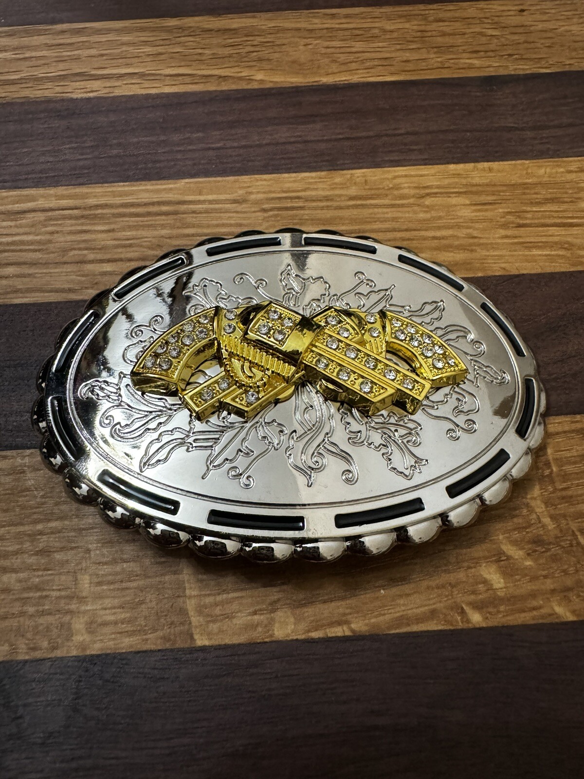 как выглядит Patriotic Overlapping Rhinestone Encrusted Golden Guns Belt Buckle фото