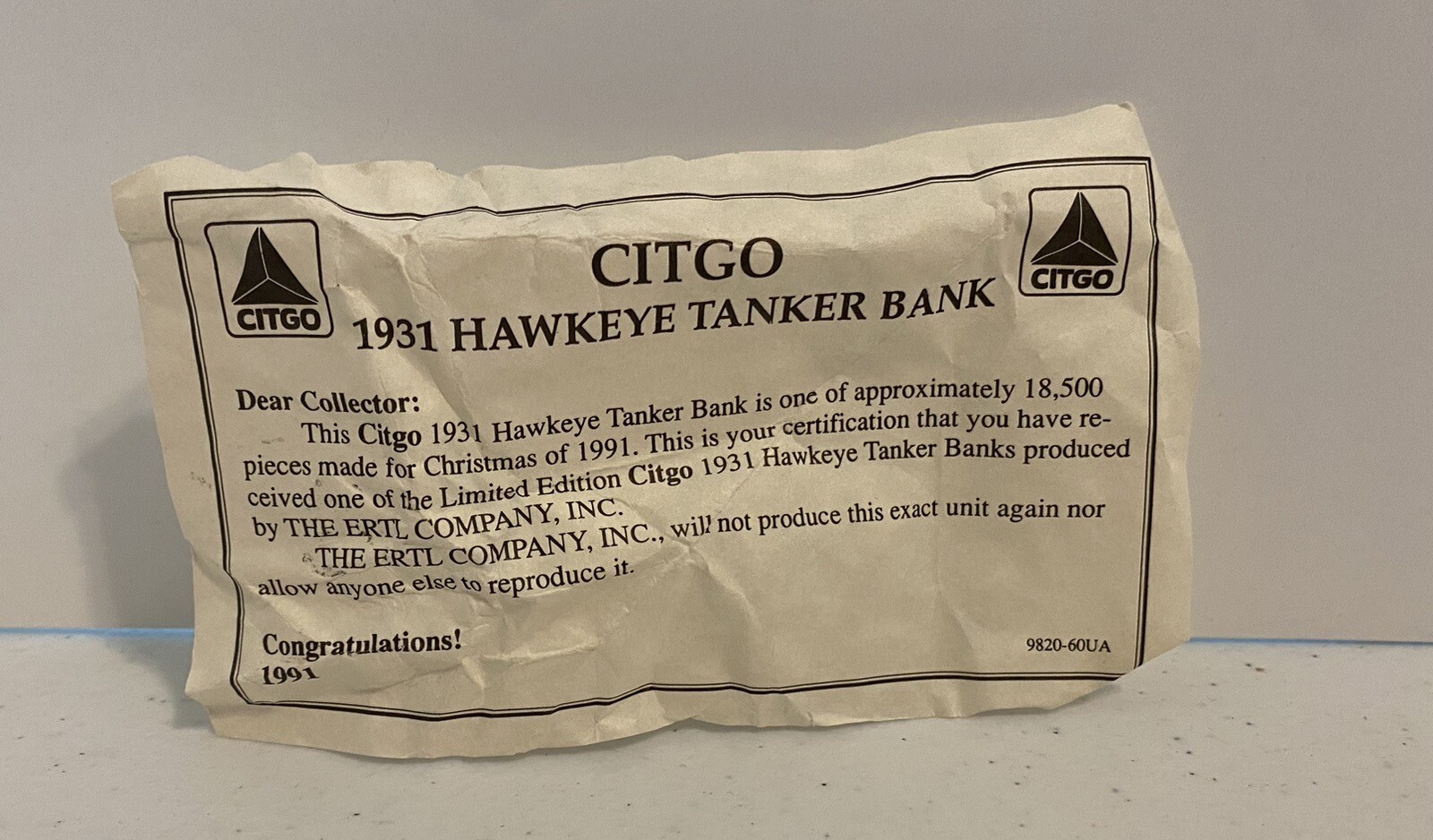 Ertl Diecast Metal 1/34th Scale Bank 1931 Hawkeye Tanker Bank Citgo Gasoline