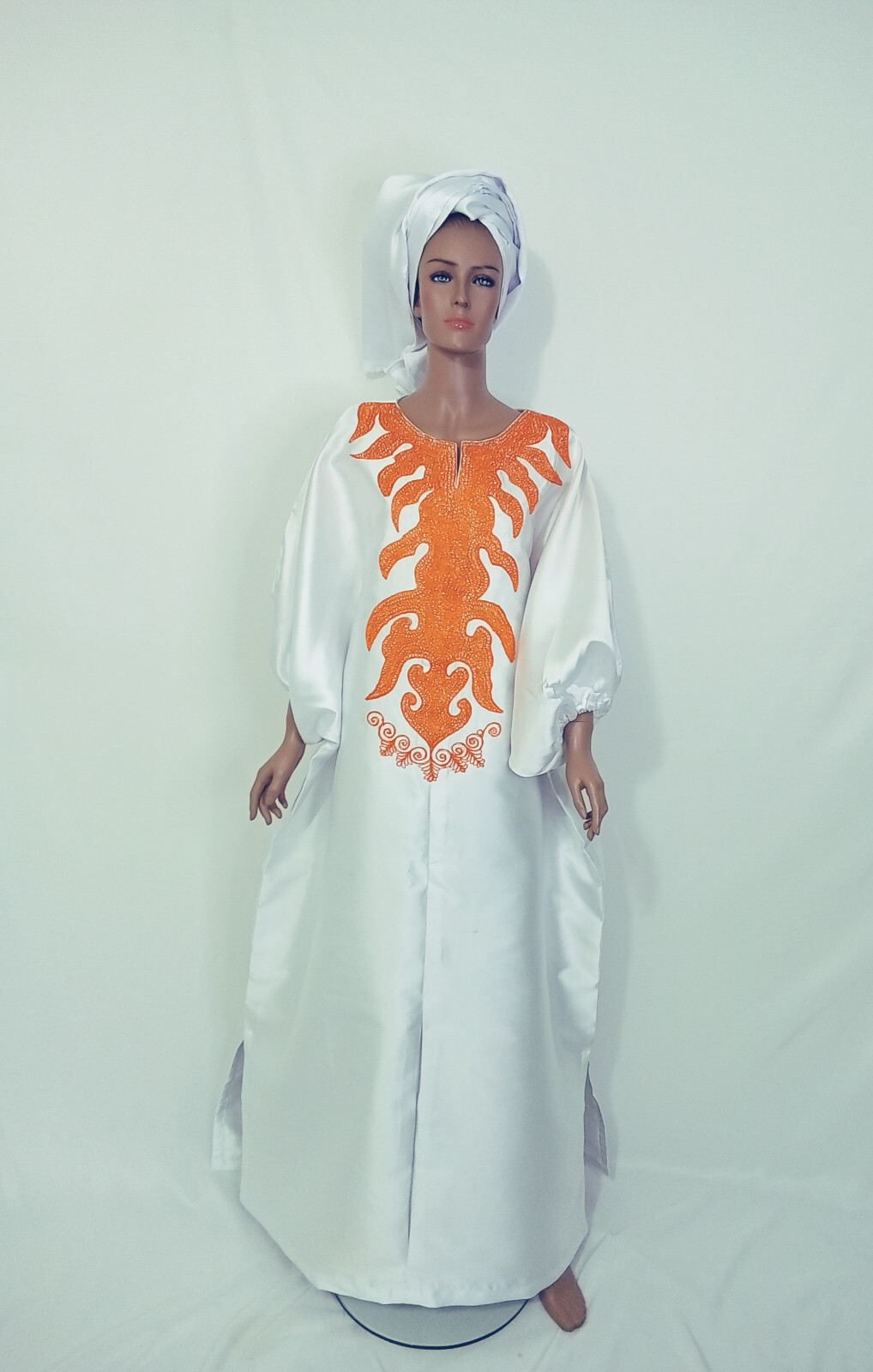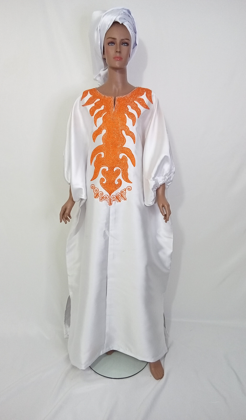 HD Embroidery White/Orange Dress Bold African Boubou Kaftan Dress Party Gown.