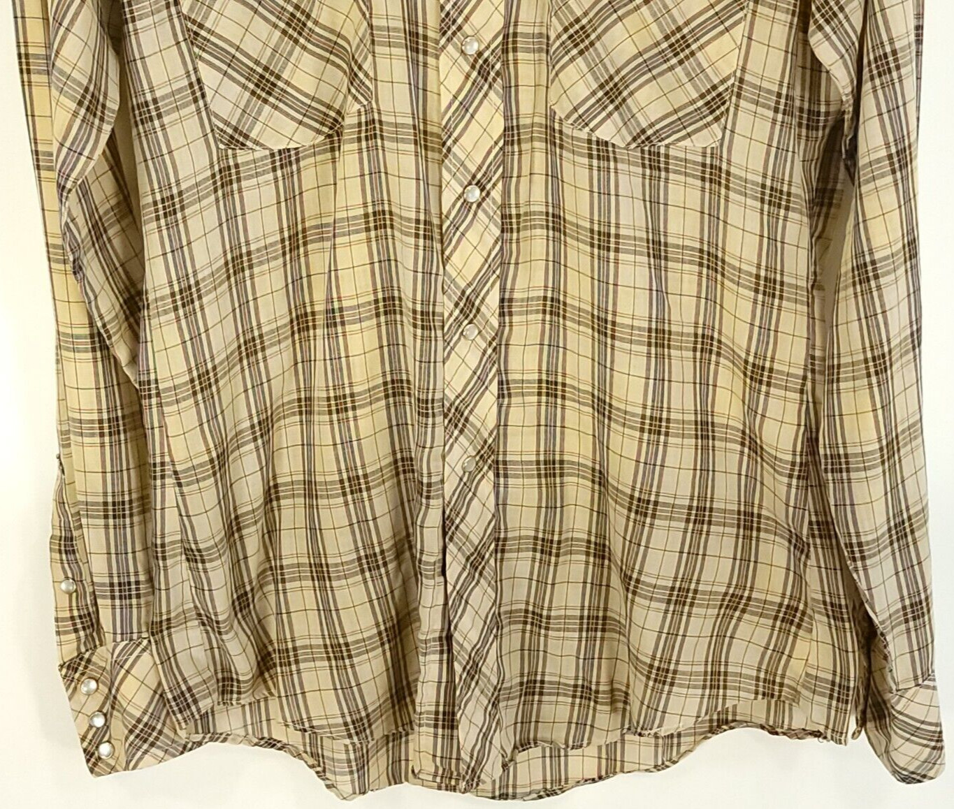 Vtg JcPenney Shirt Mens 15 1/2 Western Cowboy Snap Front Tan Navy Blue Plaid 70s