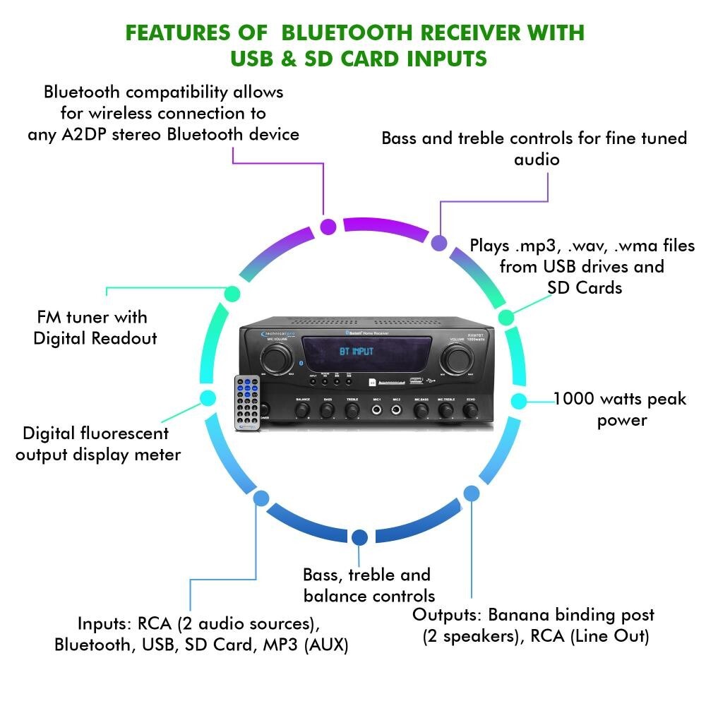 Home Theater System-1000W Bluetooth Amplifier, 2x8 Ceiling Speakers, Wire