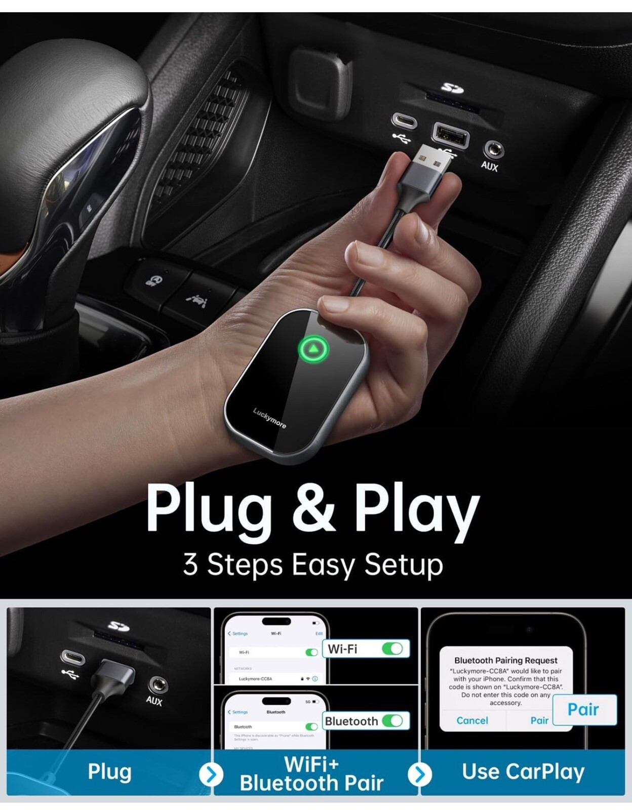 Luckymore Carplay Adapter Converts Wired to Wireless Dongle WL01-C - Black