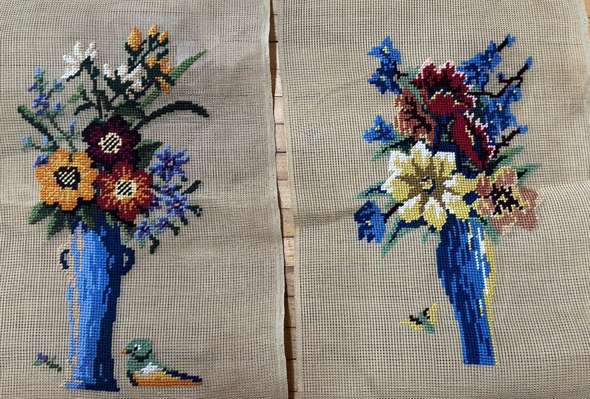 Pair Vintage Needlepoint Canvases Flowers Floral Arrangements Butterfly Bird