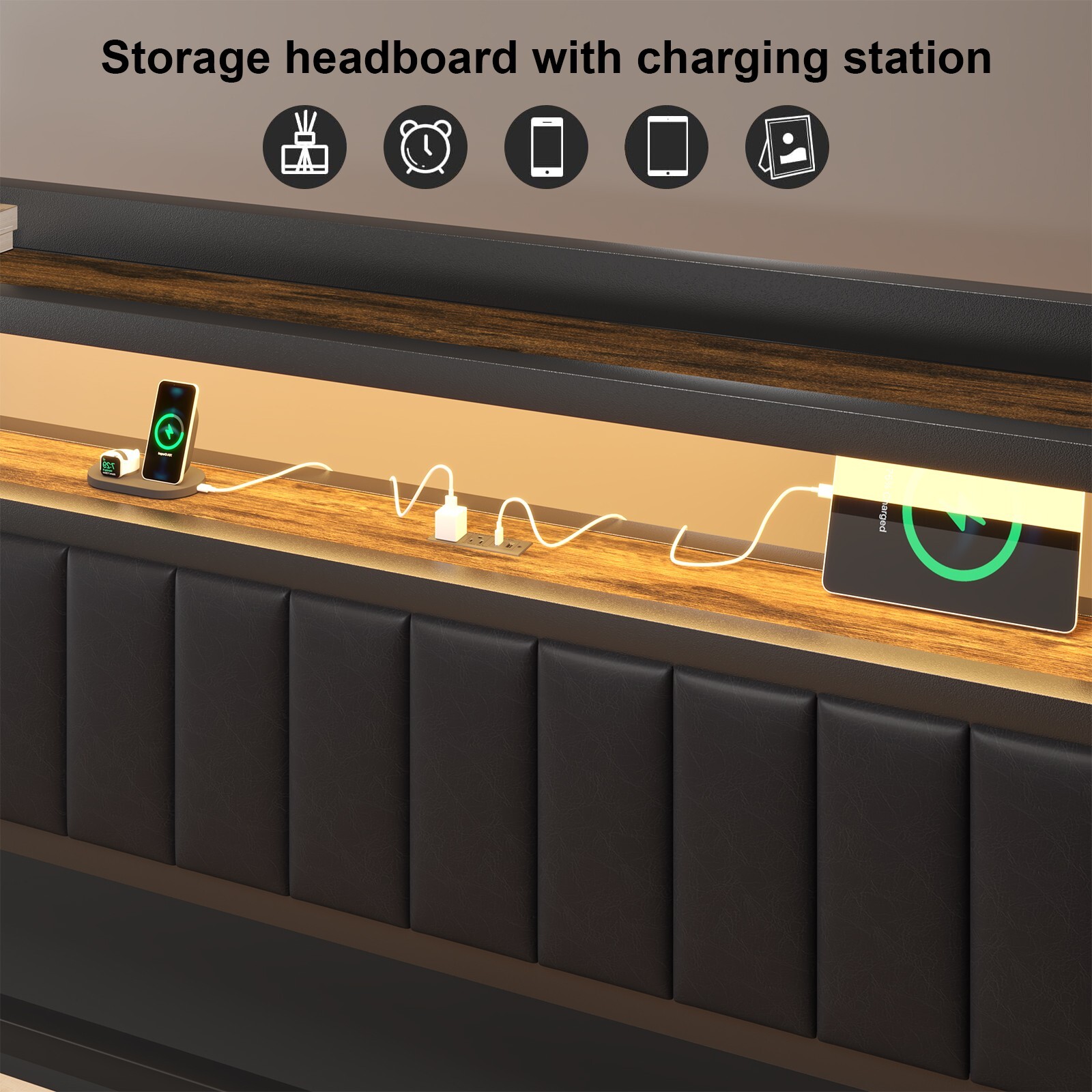 Особенности: LED Light, Squeak Resistant, Storage Headboard, Equipped with drawers, Easy Assembly, Upholstered Headboard with Charging Station
